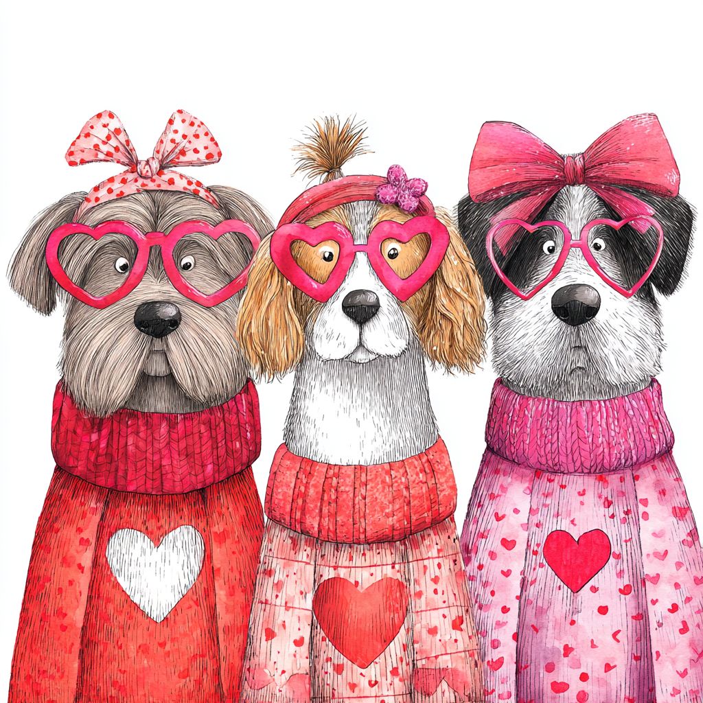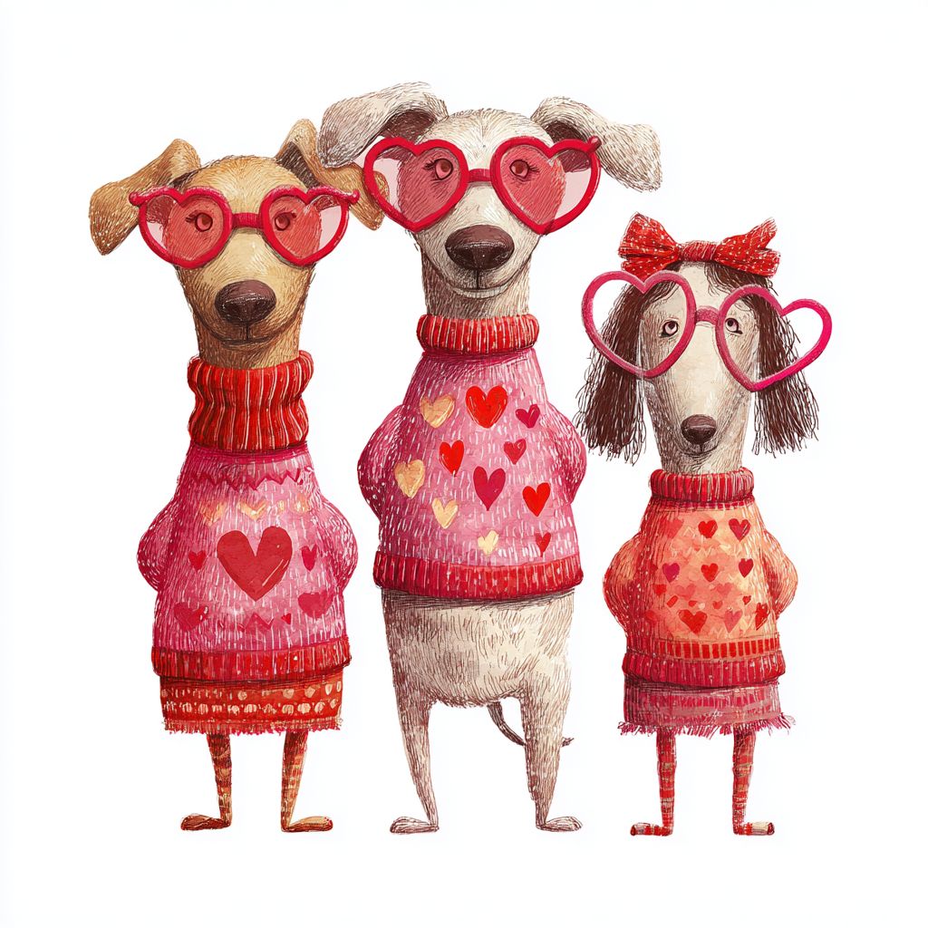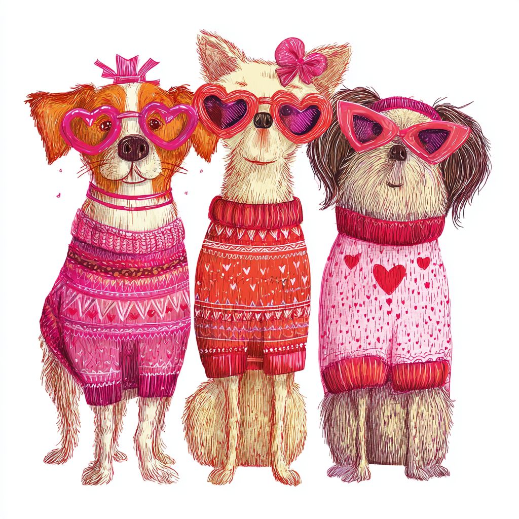 Three adorable dogs standing side by side, full body. Each dog wearing cozy knitted sweaters in red and pink tones, heart patterns, Valentine’s Day theme. Heart-shaped sunglasses, cute bows and headbands, kawaii aesthetic. Illustrated in a whimsical hand-drawn style of Mandy Disher, bright colors, detailed textured clothing (knitted sweater), watercolor effect with warm tones, expressive face with heart-shaped glasses, festive Valentine atmosphere, white background, highly detailed, digital illustration, children’s book style.