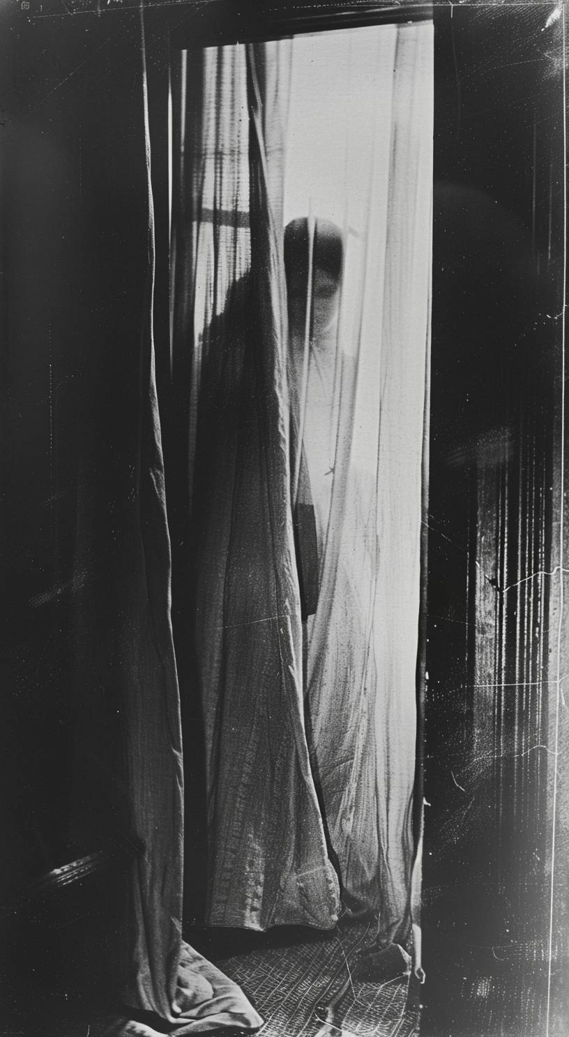 Accidental recording of a ghost behind a curtain, 1920s photography, creepy horror scene, documentary archives