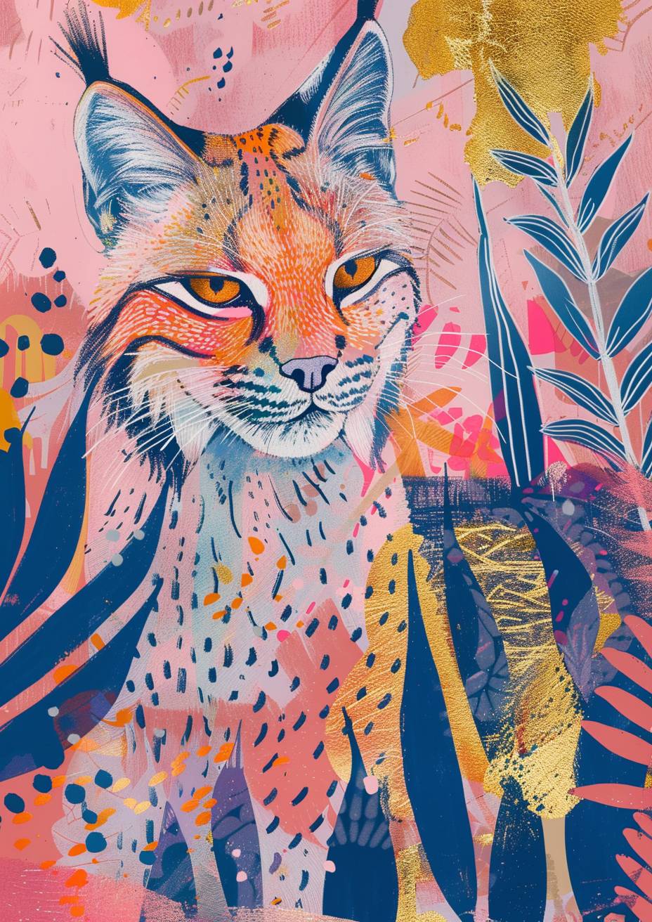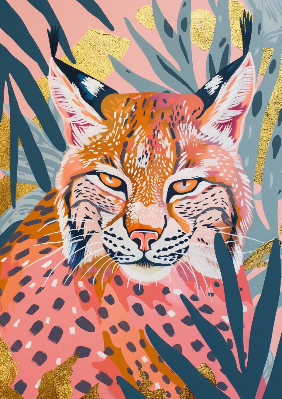 A minimal and whimsical illustration with a bold pastel color scheme; using marker art in the style of Matisse; inspired by I fall for you and aboriginal art; focusing on a lynx; the mood is playful and surrealistic. There is gold leaf all over the artwork. --ar 5:7 --v 6.0