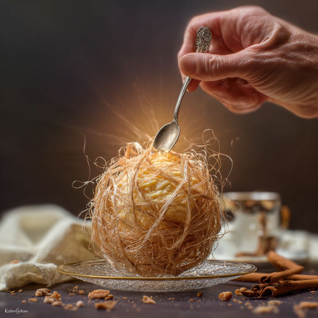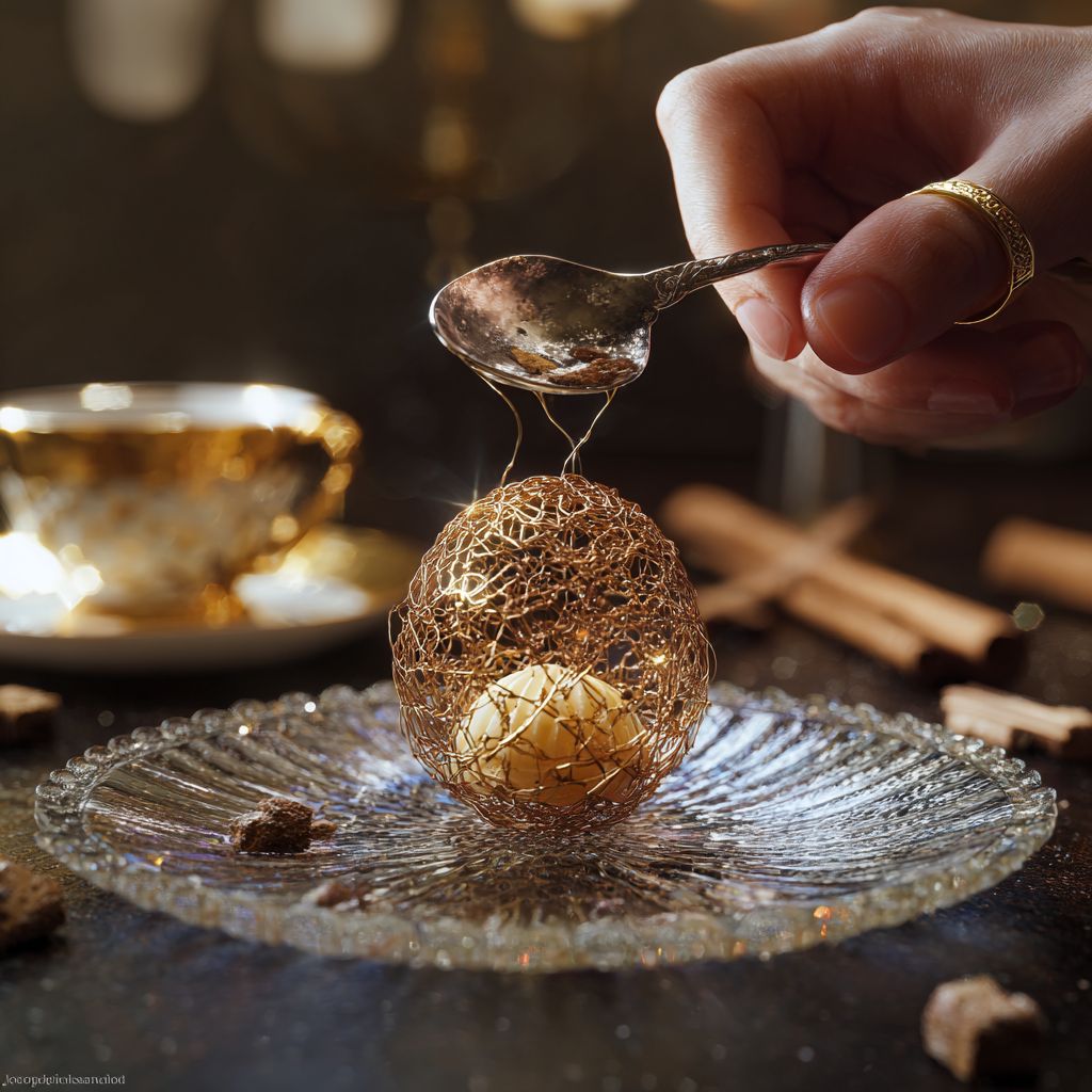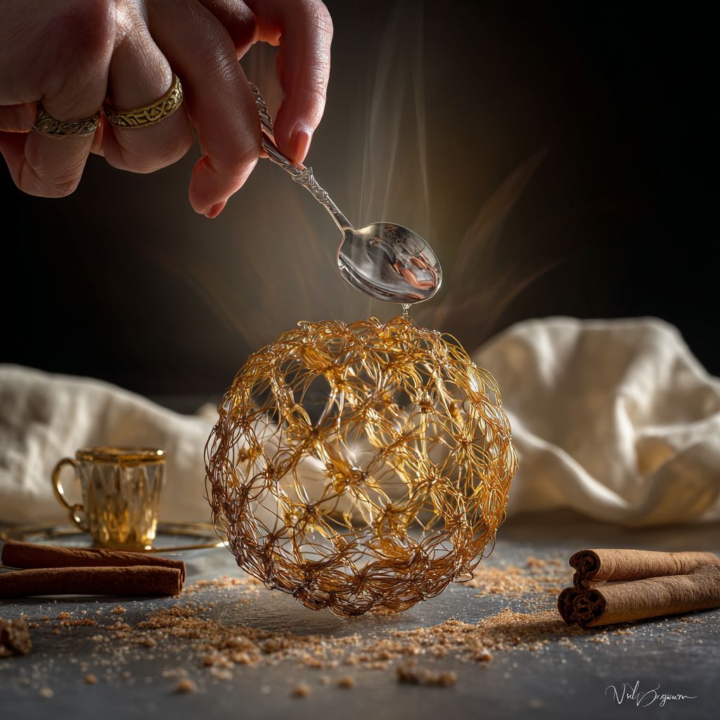 Extreme macro photography, rule of thirds. An elegant hand with a minimalist gold ring holding a vintage ornate silver spoon just above an intricate spherical cage made of hundreds hair-thin translucent golden caramel threads sition on a cristal plate. Inside the lattice, a velvety pale yellow cream core is glowing through the minimal gaps between the threads. Surroundings: Scattered cinnamon bark, a crinkled cream linen napkin, a small vintage espresso cup with gold trim, and tiny crystalline sugar crumbs on a dark basalt stone table. Lighting: Strong Mediterranean sunset light from behind (backlit), creating "god rays" through the sugar nest and sharp lens flares. Cinematic depth of field, hyper-realistic textures, 8k, shot on Hasselblad --raw --s 50