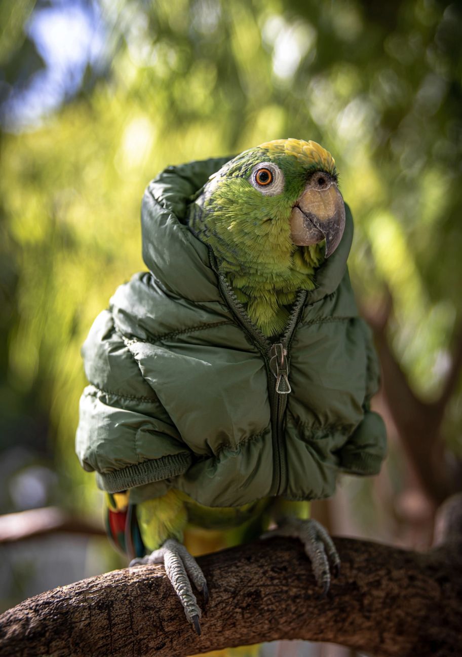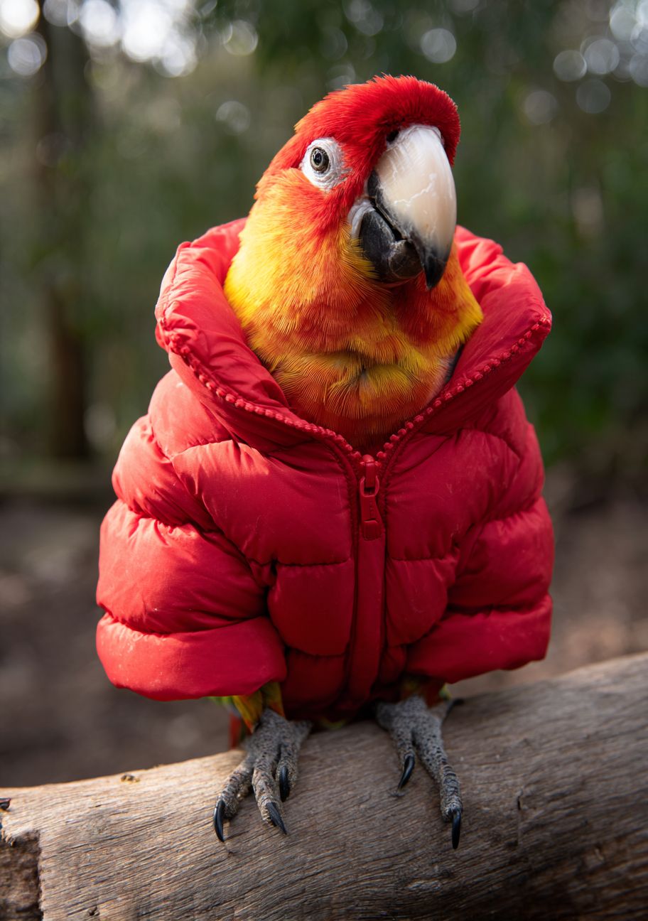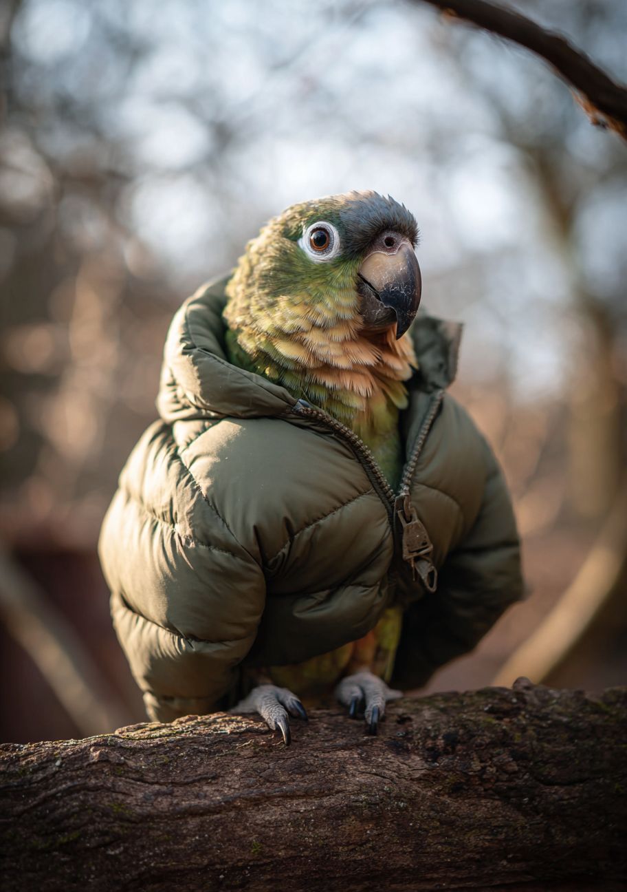 a parrot in an oversized, puffy jacket, looking at the camera, standing on top of a tree branch. cute and funny, the photograph captures the scene in natural light, resulting in a super-realistic photo. --ar 45:64 --raw --s 50