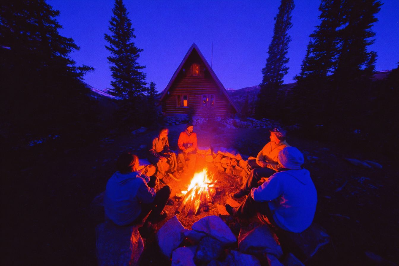 people sitting around the fire chatting --ar 3:2 --profile 2ub6rw1 --s 50 --raw