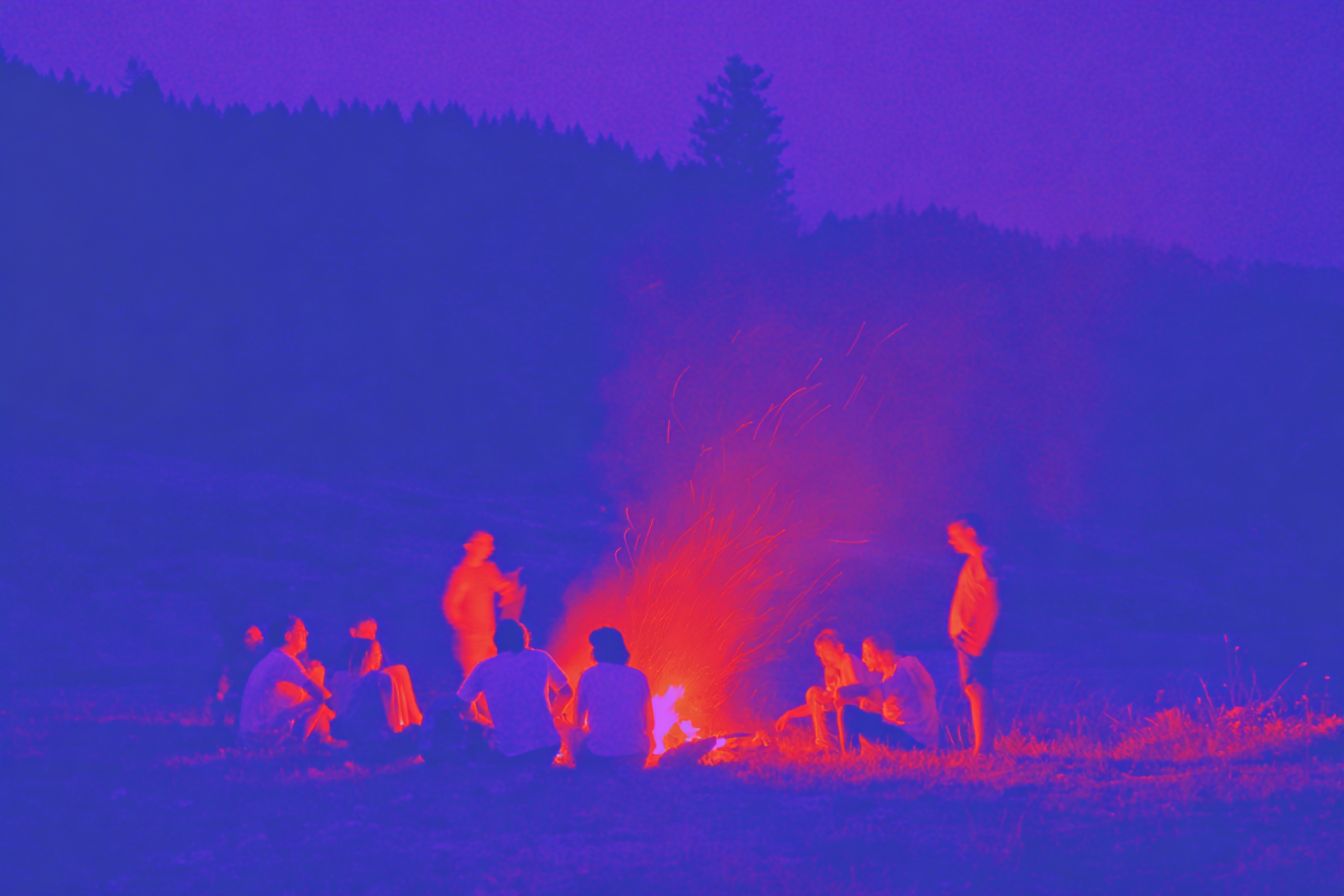 People are sitting around the fire chatting