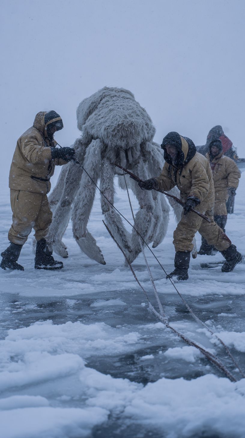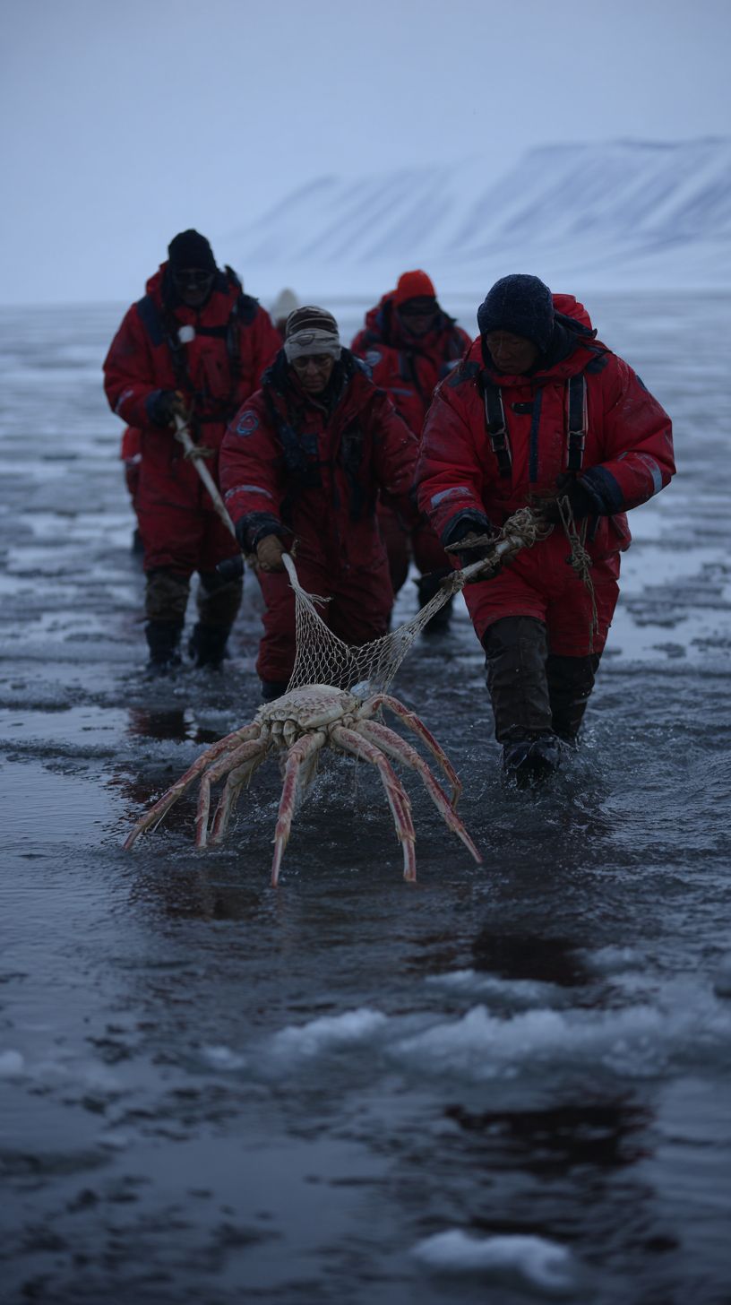 A team of polar researchers is cautiously trying to catch a gigantic hairy crab-like creature