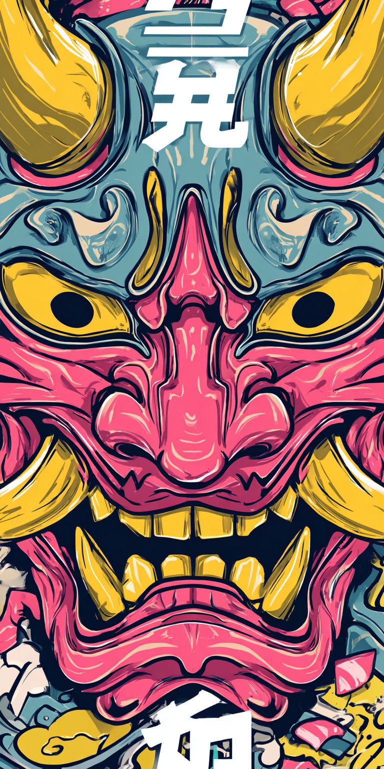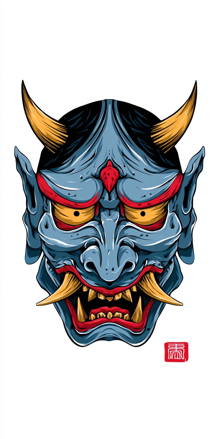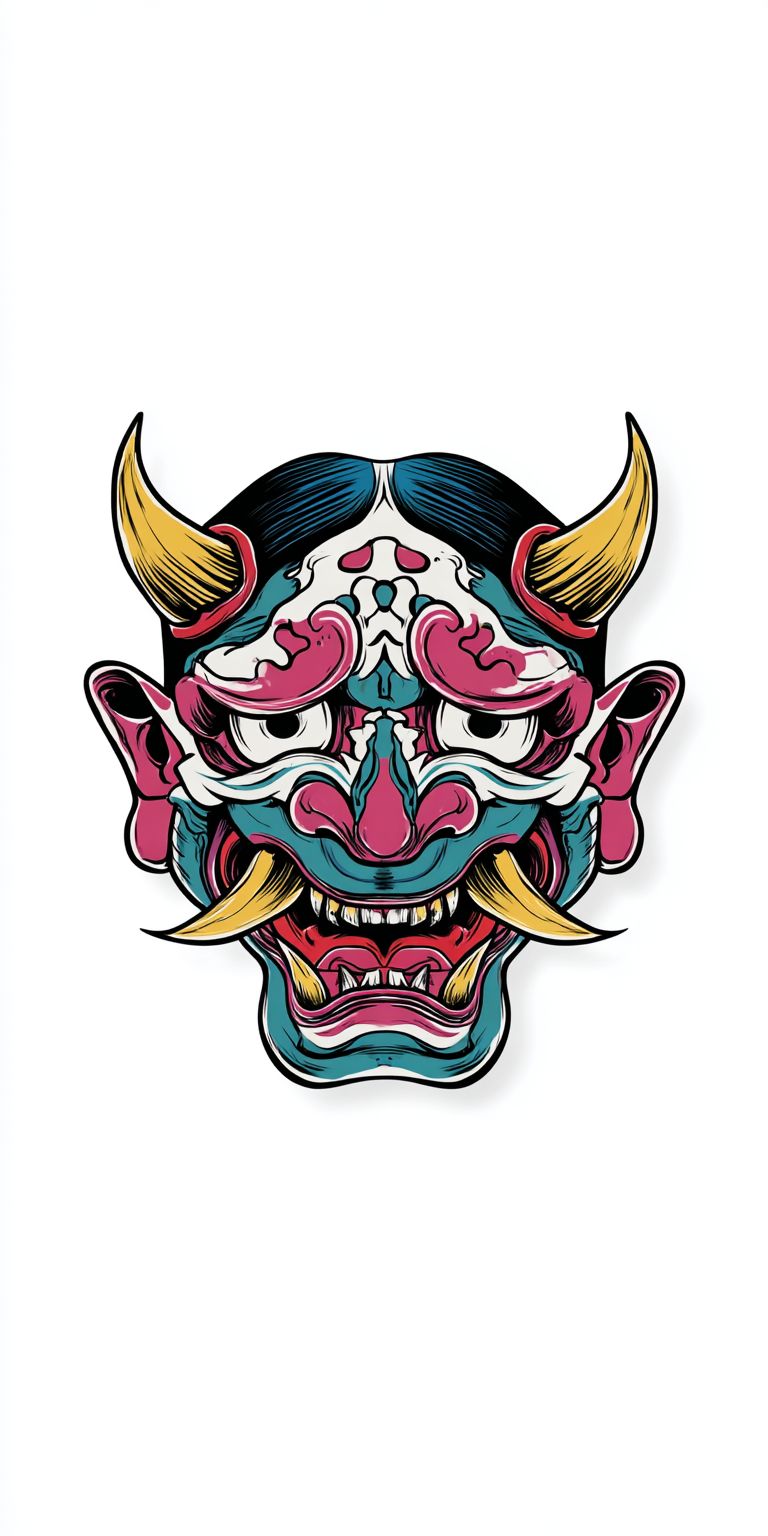front view,japanese illustration logo is about a demon mask,close up,pop art style, clean lines,logo style traditional japanese animation, street art sensibilities, very detailed, sticker design, Japanese street art,bold lines, vector graphics , colorful , white background , --ar 1:2 --raw --s 50 --v 7.0