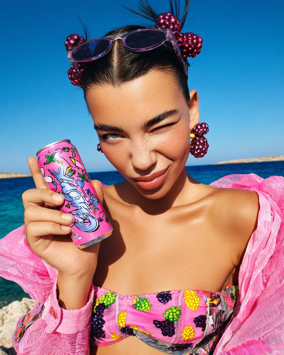 Ultra-modern youth fashion advertising photography, European-looking young woman with Mediterranean features, sun-kissed, natural beauty, Cyprus summer vibe, playful and confident, smiling and winking at the camera, holding a 0.3 liter can of La Croix sparkling water with clear readable branding, joyful summer lifestyle mood. Bright intense Mediterranean sunlight, strong natural summer sun, open blue sky and sea horizon typical of Cyprus coastline, crystal-clear light, warm atmosphere, sun reflecting from the sea, vibrant island summer energy, no moody lighting. Outfit: pink and raspberry-toned modern youth fashion look inspired by Jacquemus, Coperni, Blumarine (new era), Paloma Wool, Ganni, Ottolinger, lightweight summer fabrics suitable for hot Mediterranean climate, visible weave and folds, stylized graphic blackberry prints on pink clothing, decorative fashion patterns, clearly non-realistic fruit design. Accessories main visual focus (very important): blackberry-shaped hair clips made of glossy plastic, colored glass and metal, sculptural designer look, deep blackberry purple, reflective surfaces, clearly artificial jewelry, blackberry-colored sunglasses with deep purple translucent plastic frames and tinted lenses, modern youth fashion design, strong sunlight reflections, earrings shaped like raspberries and blackberries made of glass, resin and metal, high-gloss finish, sculptural fashion jewelry, non-organic, non-food look, layered beads and necklaces made of plastic and glass in berry tones, thin polished metal chains, fashionable metal ear clips, small trendy handbag with berry-colored accents and visible texture, smartphone in a colorful designer plastic phone case held casually. Material emphasis: artificial decorative materials only glossy plastic, [...]