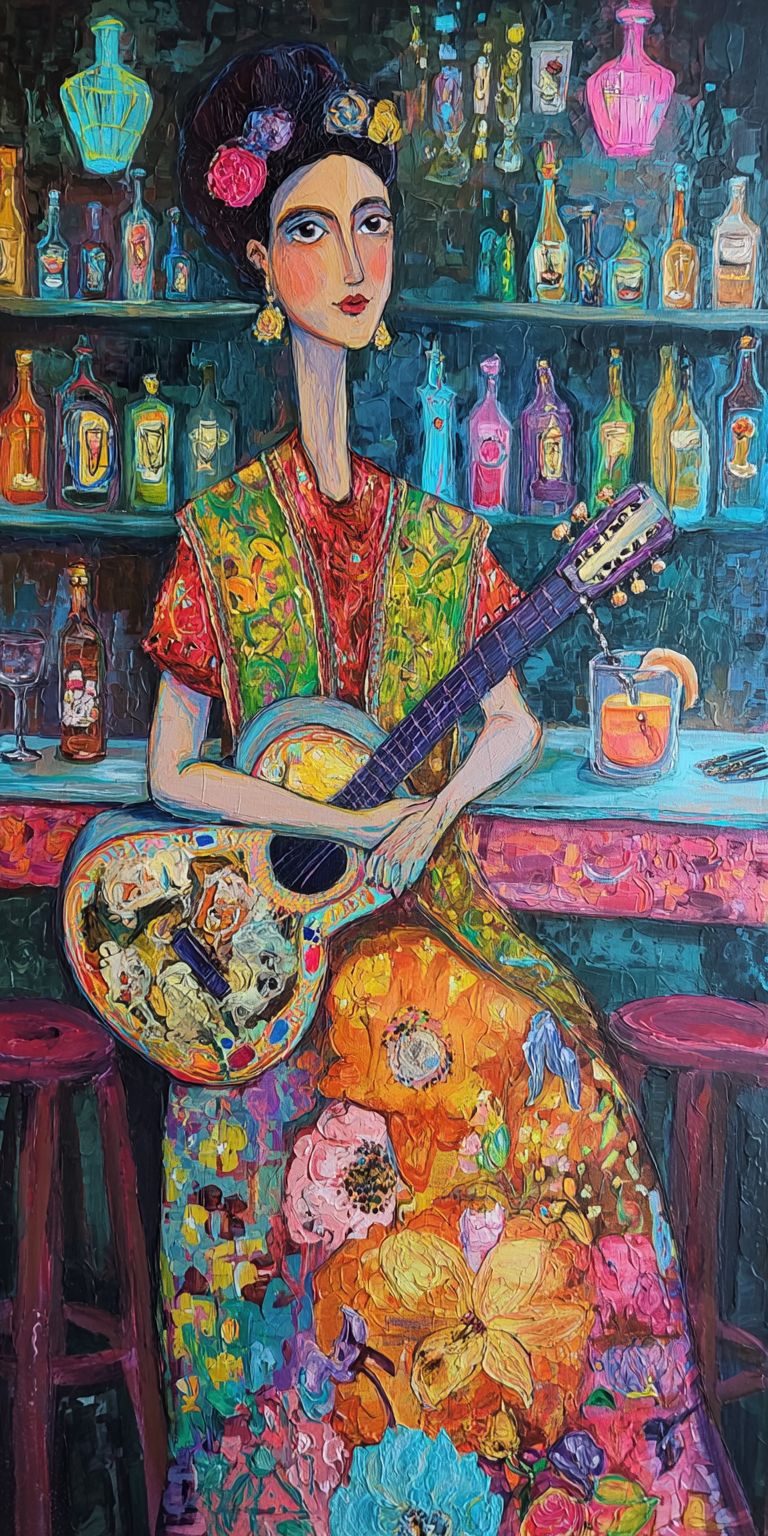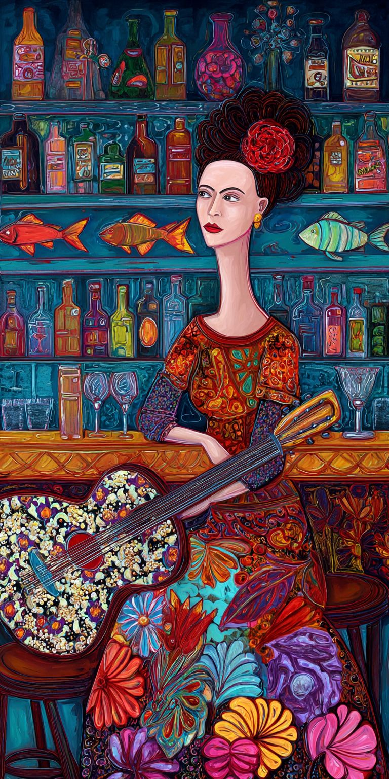 a painting in the style of Freida Kahlo of a surreal women with a super long neck with a wearing an ornate print neon color dress sitting at a bar with neon fish lights and hand drawn colorful bottles on a shelf in the background playing a guitar decorated with a painting of Gustav Klimt flowers on the front --ar 1:2 --s 50 --v 7.0 --raw