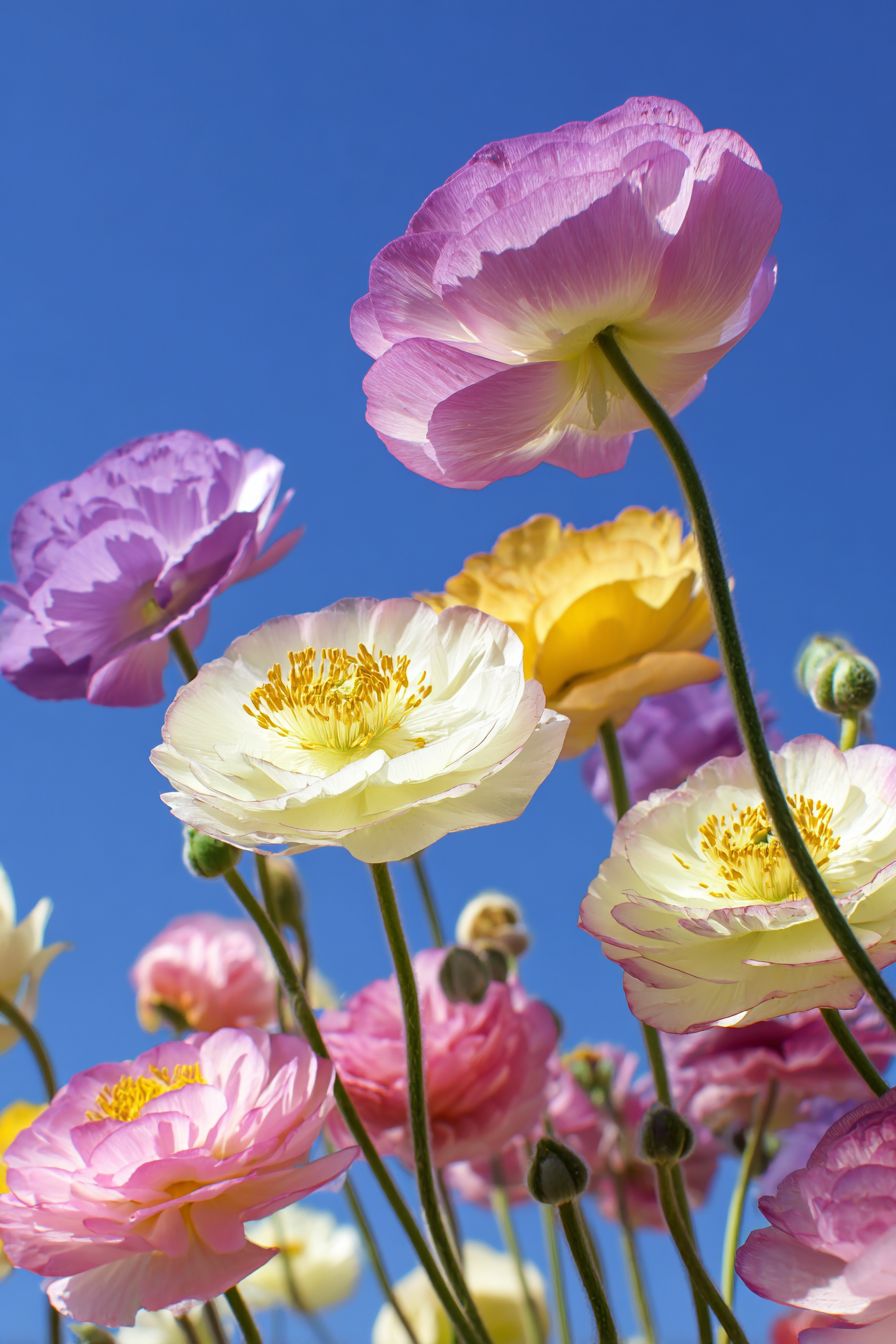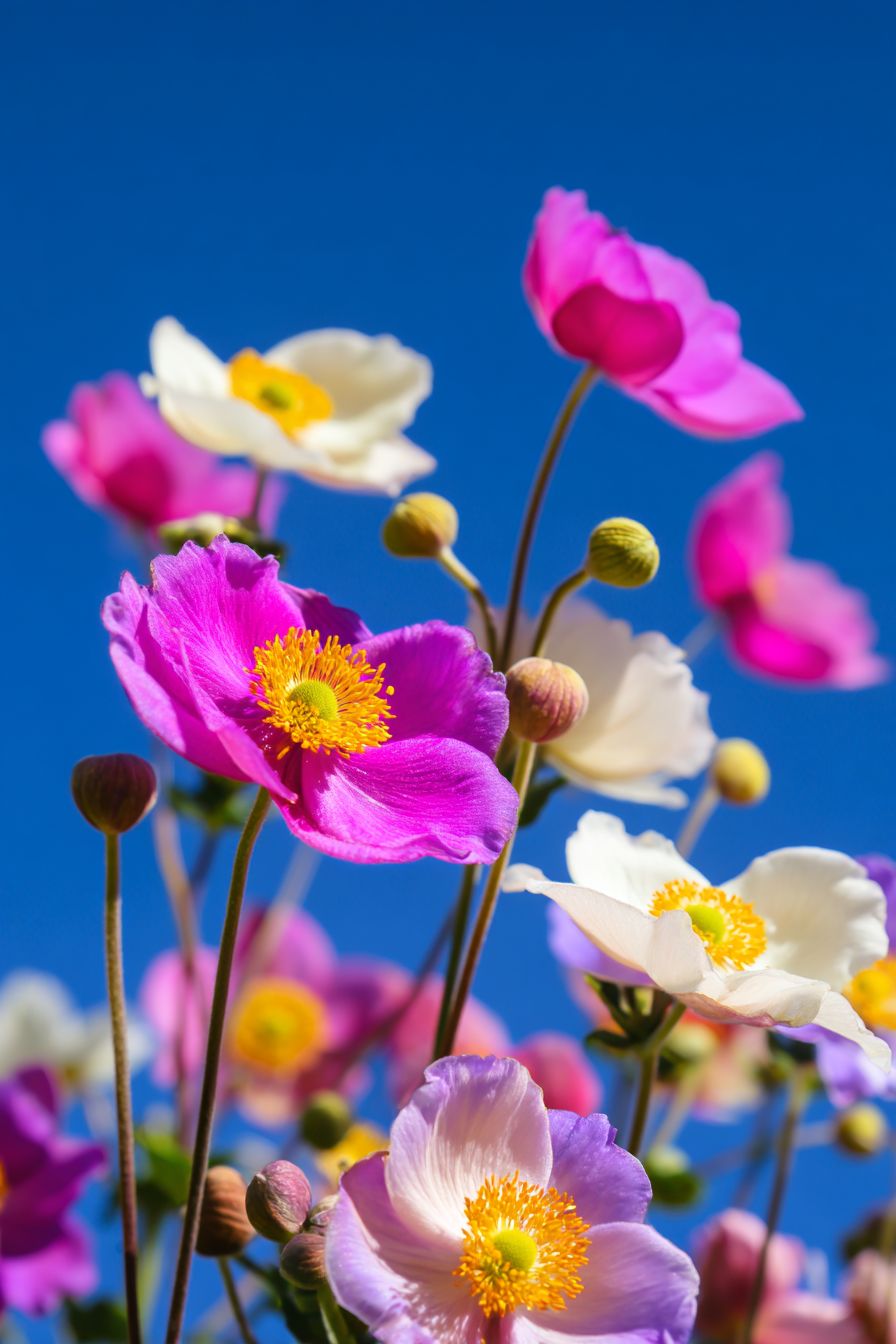 This is a flower filled with dreamy colors. In the picture, multiple adorable flowers are blooming joyfully against a backdrop of deep blue sky. These flowers are vibrant in color, featuring soft pinks, elegant purples, pure whites, bright yellows, and blues. Each flower has plump, rounded petals that are delicate and soft like fluffy cream, light and airy. The tender yellow stamens are dotted in the center of the petals, creating a striking contrast with the colorful petals, making them look particularly playful and cute. The flower stems are slender and straight, supporting the large blossoms; some flowers are fully open while others are still in bud, arranged in a pleasing manner, showcasing a thriving vitality and energy, giving a sense of pure beauty and innocence, as if one is in a fairy-tale world of flowers.