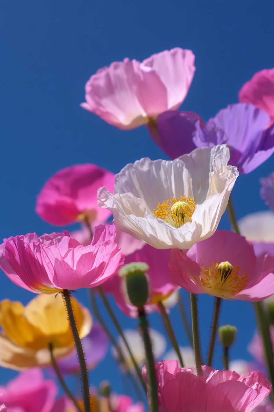 This is a flower filled with dreamy colors. In the picture, multiple adorable flowers are blooming joyfully against a backdrop of deep blue sky. These flowers are vibrant in color, featuring soft pinks, elegant purples, pure whites, bright yellows, and blues. Each flower has plump, rounded petals that are delicate and soft like fluffy cream, light and airy. The tender yellow stamens are dotted in the center of the petals, creating a striking contrast with the colorful petals, making them look particularly playful and cute. The flower stems are slender and straight, supporting the large blossoms; some flowers are fully open while others are still in bud, arranged in a pleasing manner, showcasing a thriving vitality and energy, giving a sense of pure beauty and innocence, as if one is in a fairy-tale world of flowers. --ar 2:3 --s 50 --v 7.0 --raw