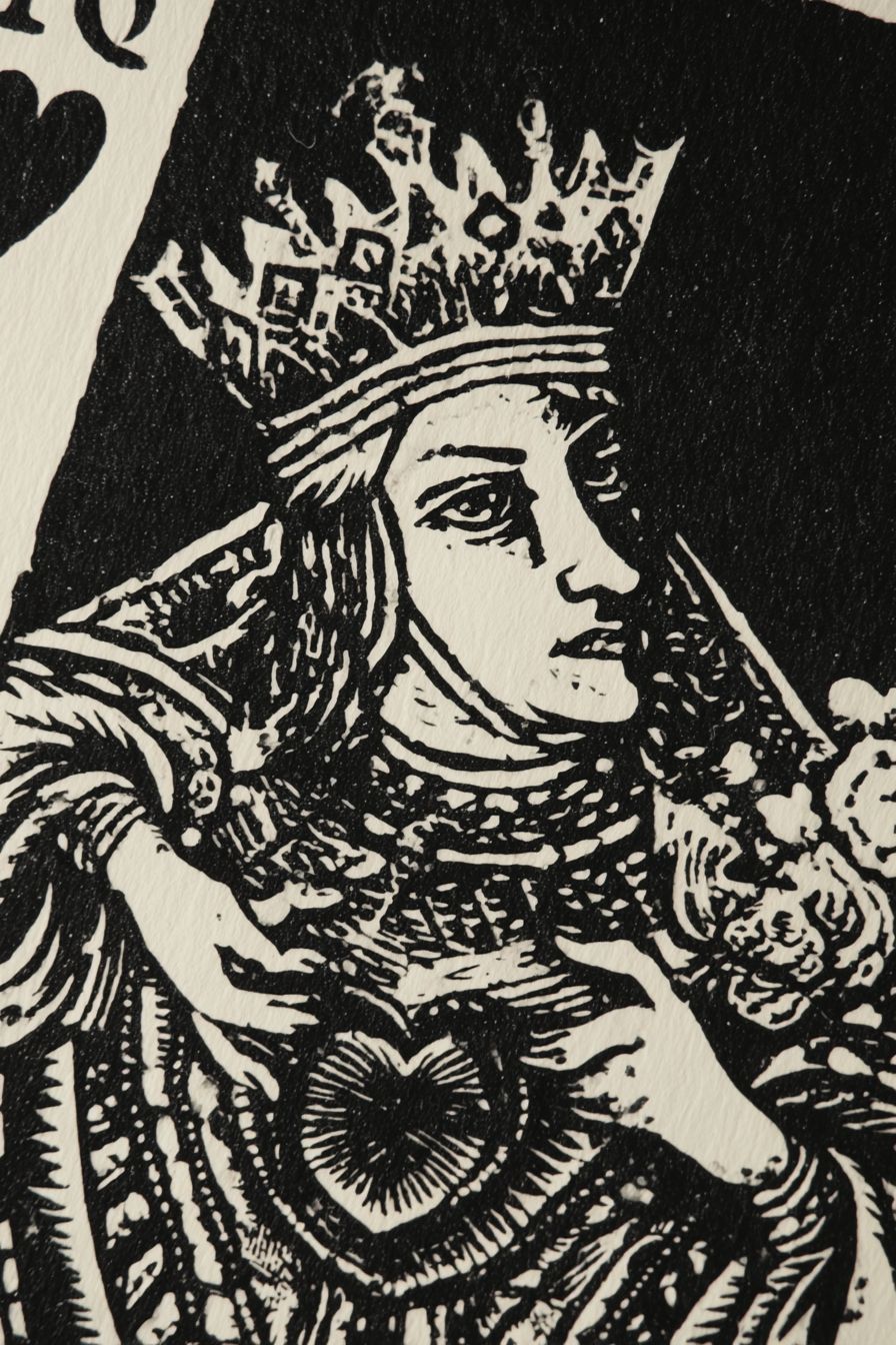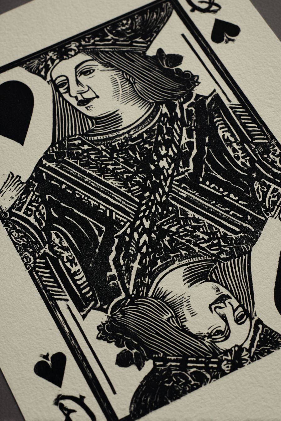 A playing card of the queen of hearts in the style of Mucha, relief printmaking, linoprint, strong negative space