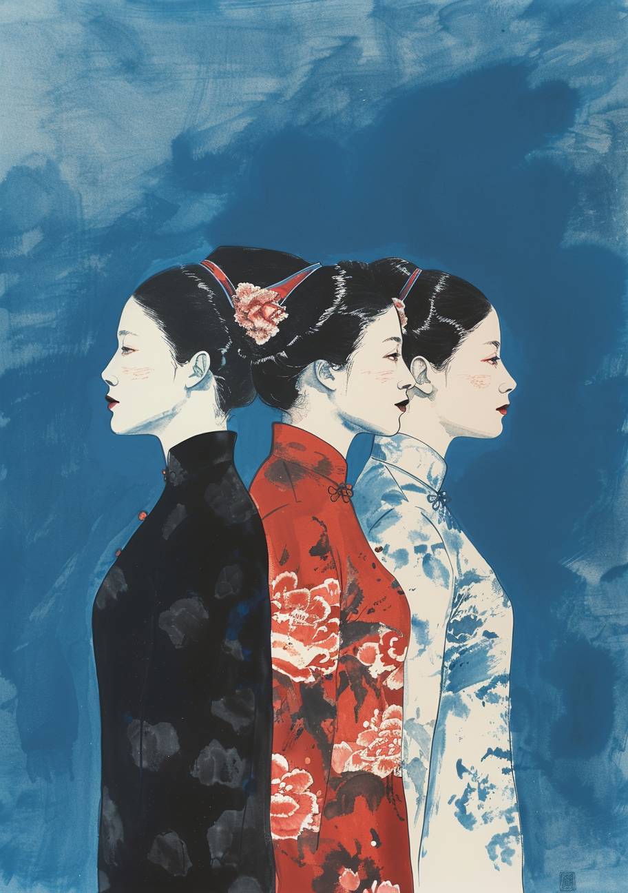 A hand-drawn ink portrait of a Chinese writer, featuring three different times Chinese women wearing different clothes standing side by side: one ancient Chinese woman in traditional clothing, one 1920s woman in a cheongsam, and one 2020s woman in a modern black suit. The background features an elegant sky blue color, styled in the manner of Wu Guanzhong and Zhang Daqian, with clean lines, high resolution, white paper background, ink painting, in a Chinese traditional art style.