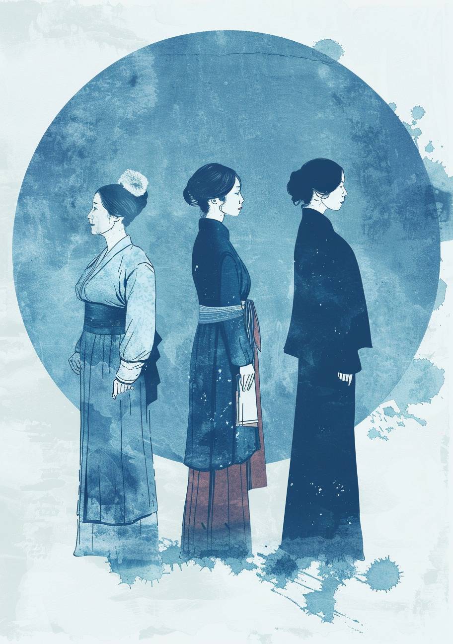 A hand-drawn ink portrait of a Chinese writer, featuring women from different eras against an elegant sky blue background.
