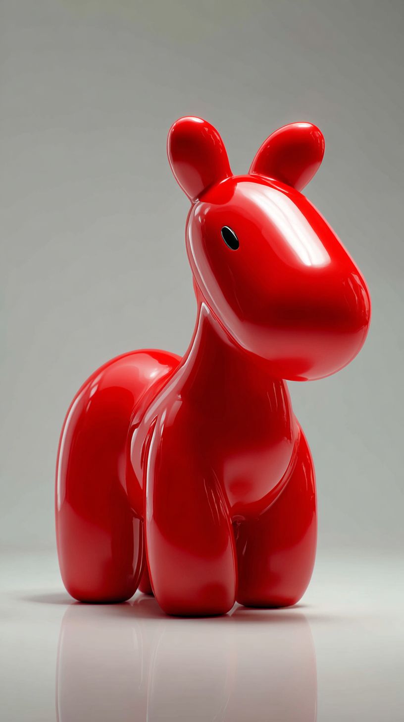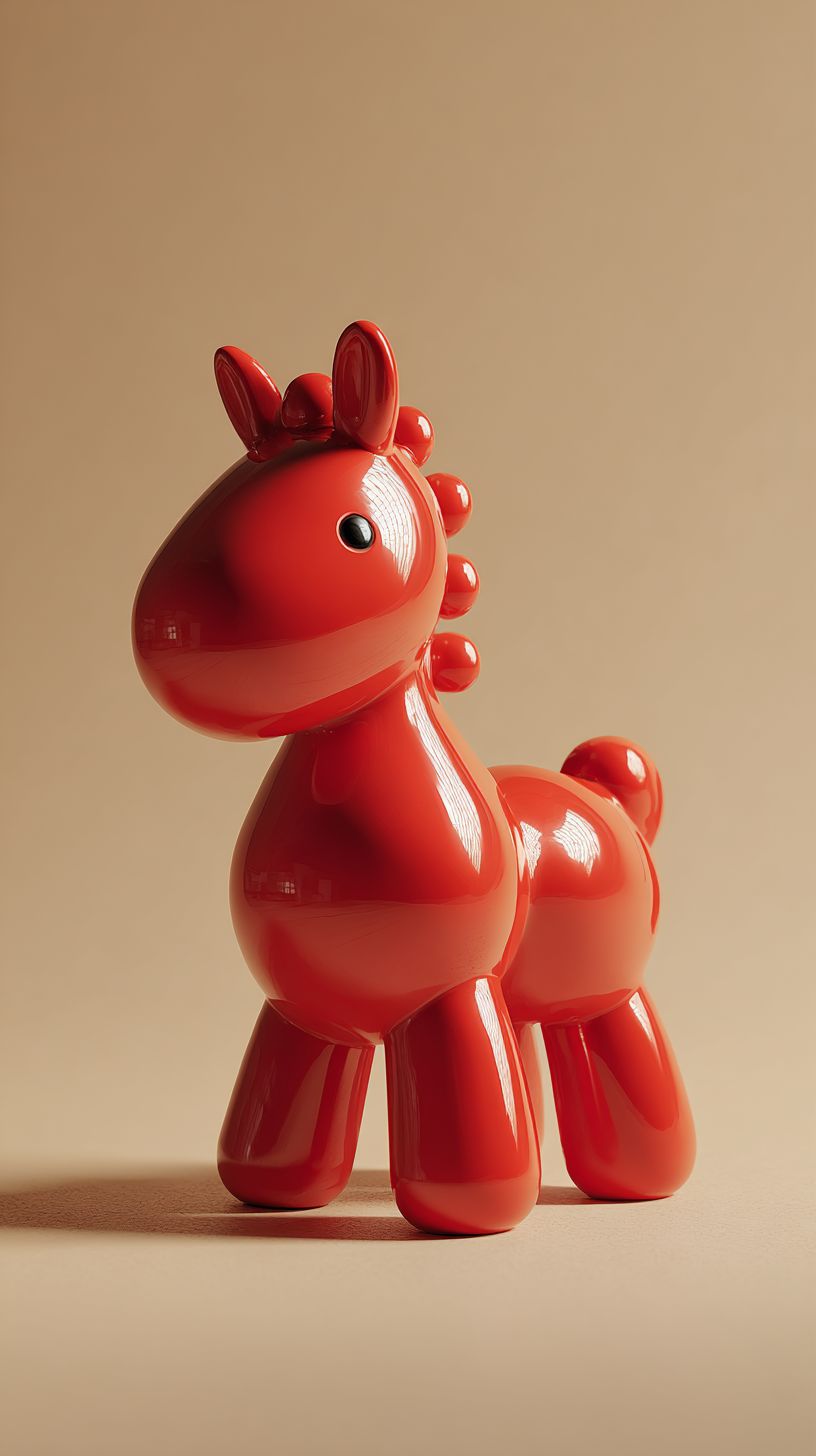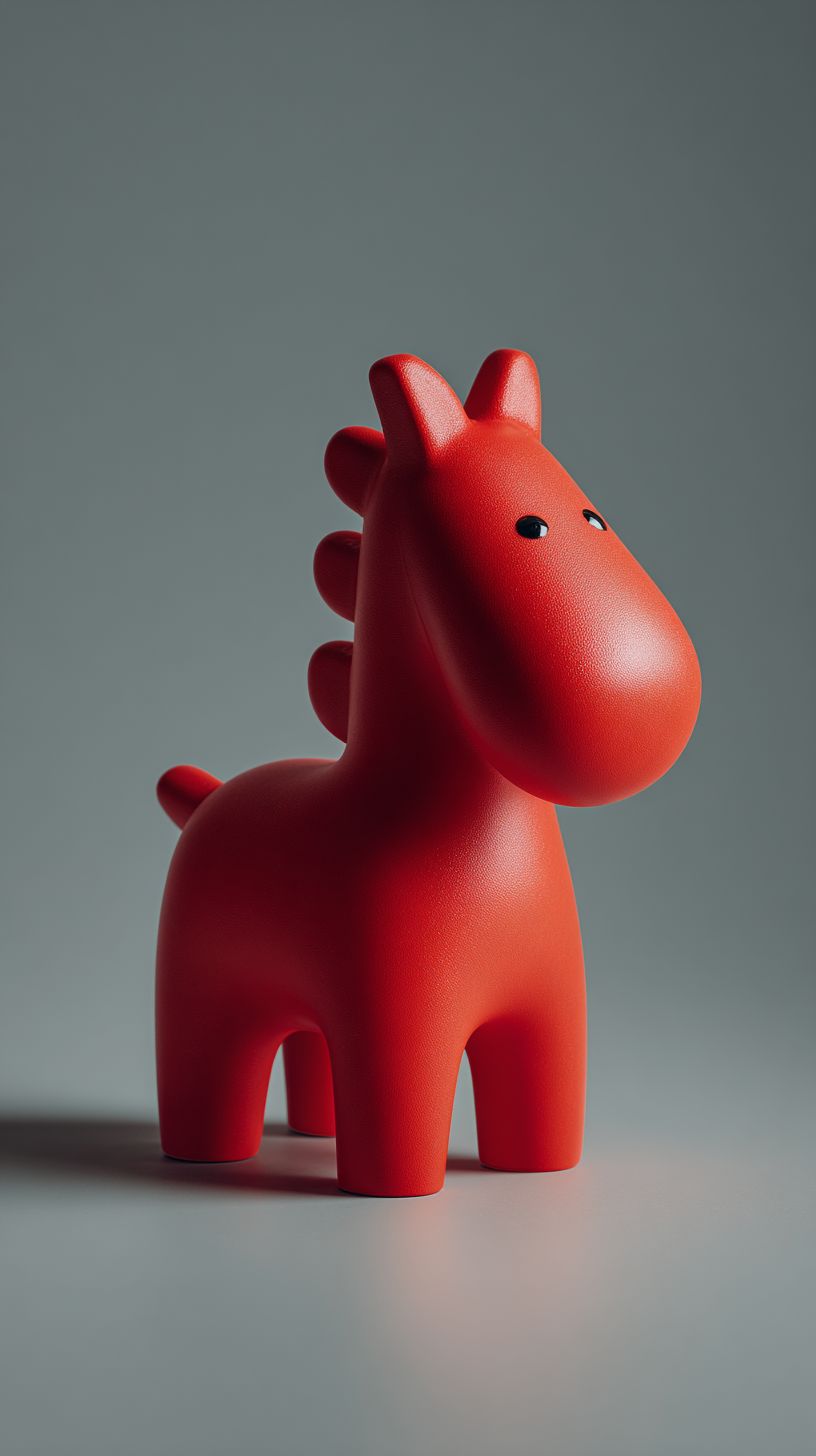 A pure white background with a single centered subject, a modern minimalist red horse figurine, rounded and chunky proportions with an abstract, playful design, smooth one-piece form with no visible seams, finished in a soft matte or satin plastic material, solid vibrant red color without strong reflections, gentle edges and strong volumetric presence, short and sturdy legs, simplified head with only tiny dot eyes for expression, mane and tail formed as minimal geometric bumps, overall style modern, cute, restrained, and design-forward, resembling contemporary designer toys or art objects, soft studio lighting with subtle ground shadow, clean, quiet, and premium composition. --chaos 5 --ar 9:16 --raw