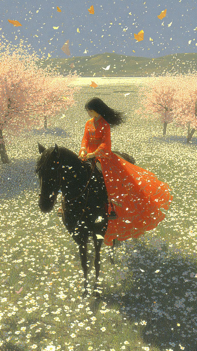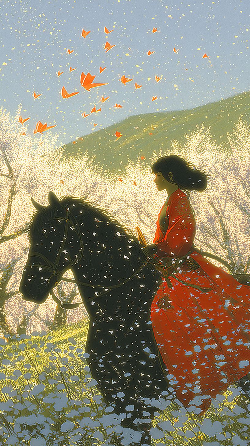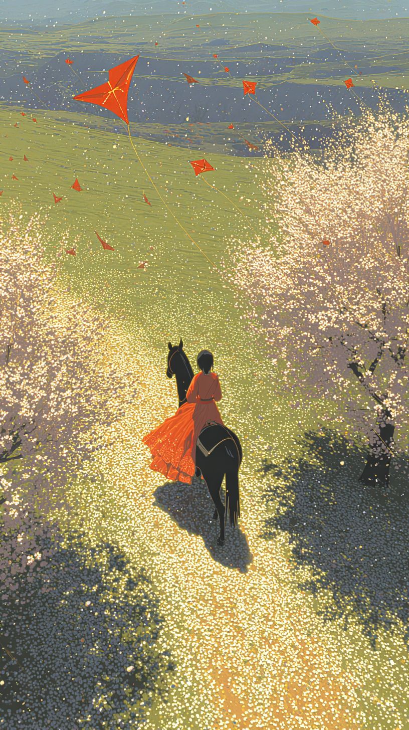Vertical composition, a young Chinese woman in a gradient water-red Hanfu dress rides a glossy black horse through a blooming cherry blossom forest in spring, pink and white petals swirling in the wind, her black hair adorned with a cherry blossom branch, hand-painted style kites (swallow and butterfly shapes) flying in the pale blue sky, distant dark green hills, soft grainy texture, vibrant pastel colors, dreamy and romantic atmosphere, Chinese illustration style --ar 9:16 --sref 3198714103 4240001336