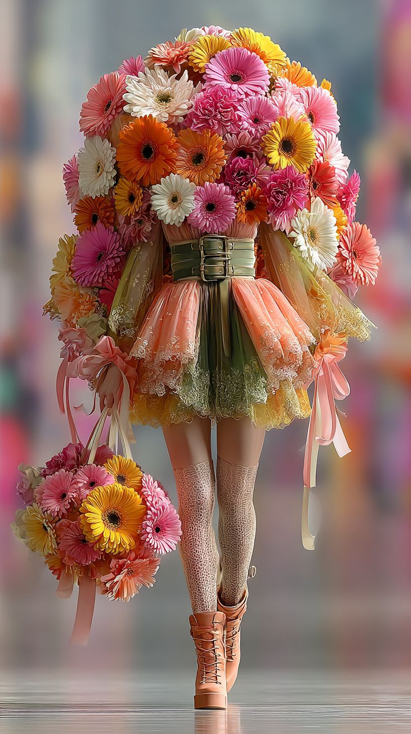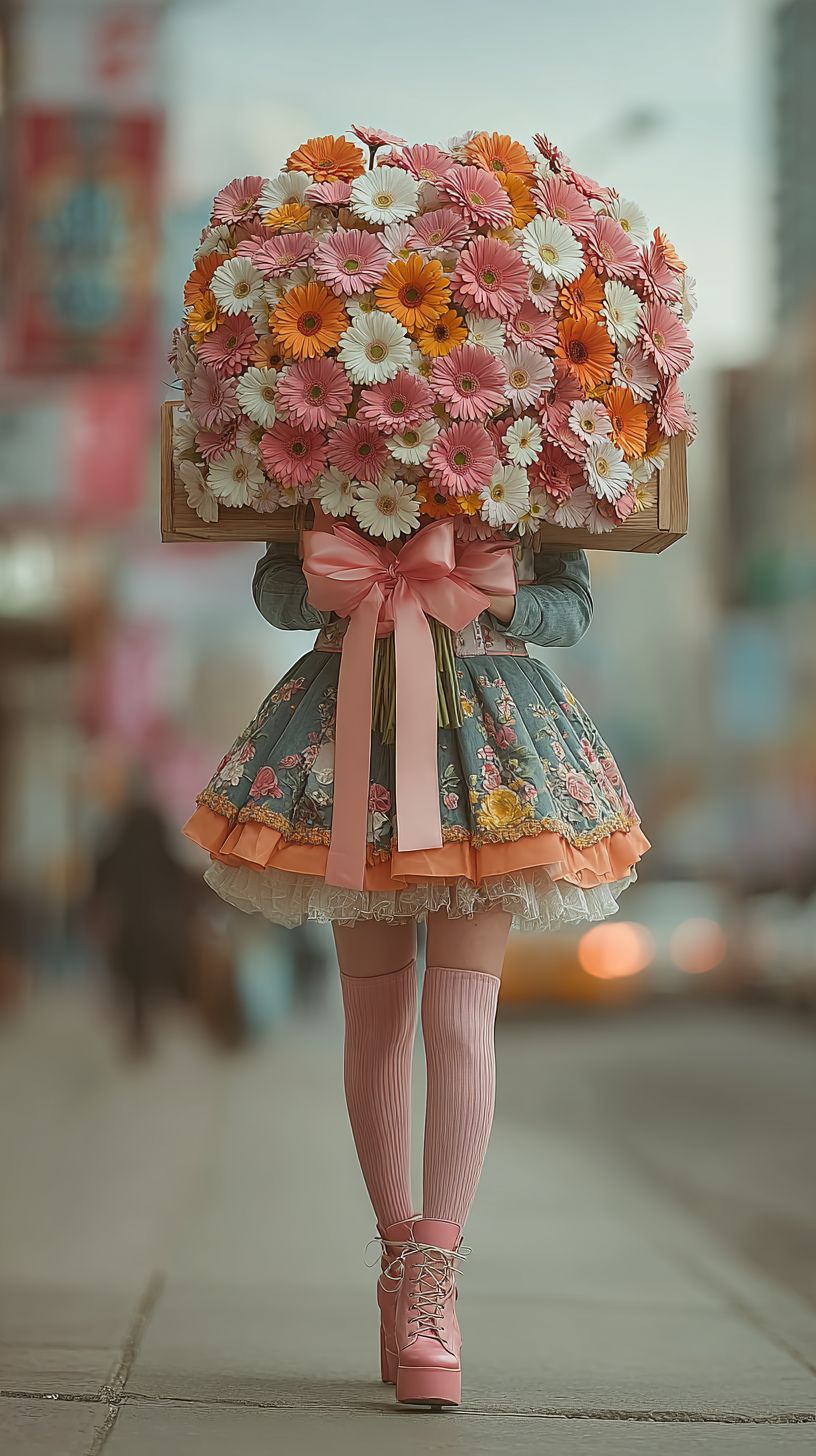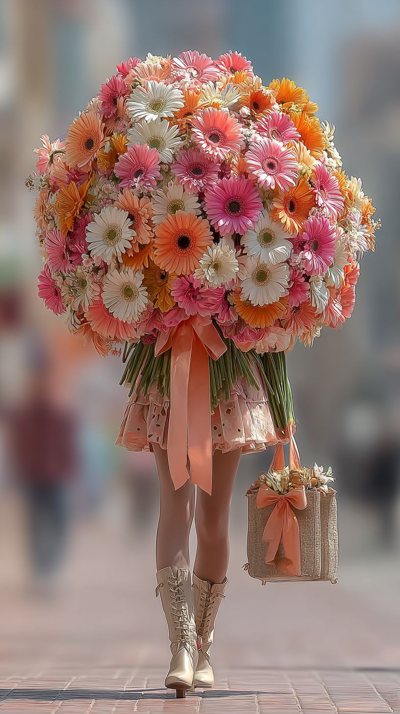 a surreal fashion scene in the city, huge walking bouquet characters, the lower half looks like a stylish young woman: mini skirt, long slim legs in sheer tights, high heeled boots, instead of torso and head there is an enormous bouquet of 1000 gerbera daisies in wrapping paper, extremely dense, very lush, round, voluminous bouquet of mixed gerberas in vibrant shades of hot pink, coral, orange, sunny yellow, and creamy white with contrasting dark centers, accented by fresh green foliage, wrapped in layered kraft and pastel peach-and-coral elegant wrapping paper, tied with a satin ribbon, walking along a modern European city street, pavement, storefronts softly blurred in the background, bright but soft daytime light, looks like high-end street style fashion photography shot on a professional camera, ultra realistic, natural colors, detailed fabric and wrapping paper texture, sharp focus on the bouquet-girl, slight background bokeh, no text, no logos --chaos 15 --ar 9:16 --stylize 500