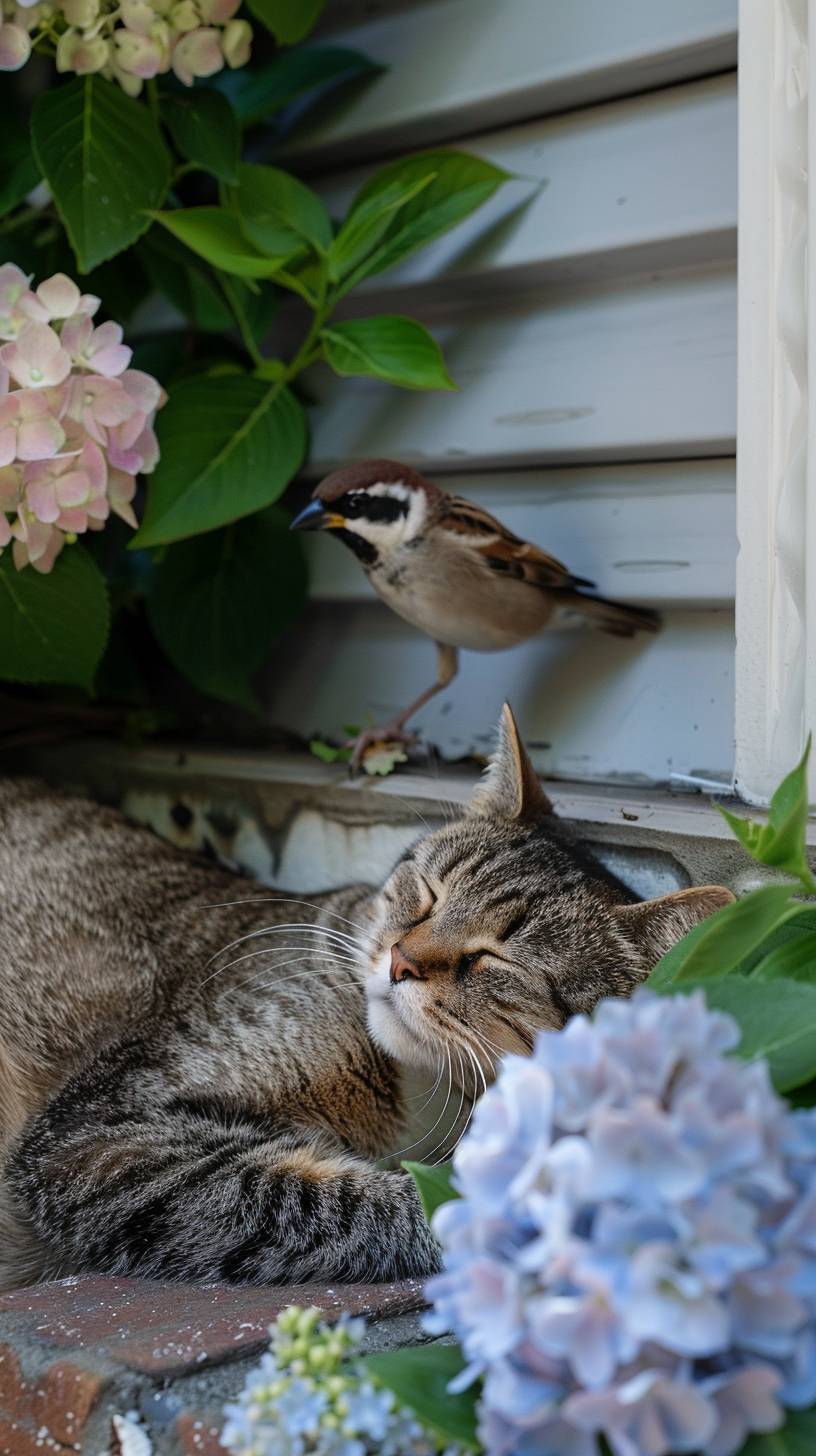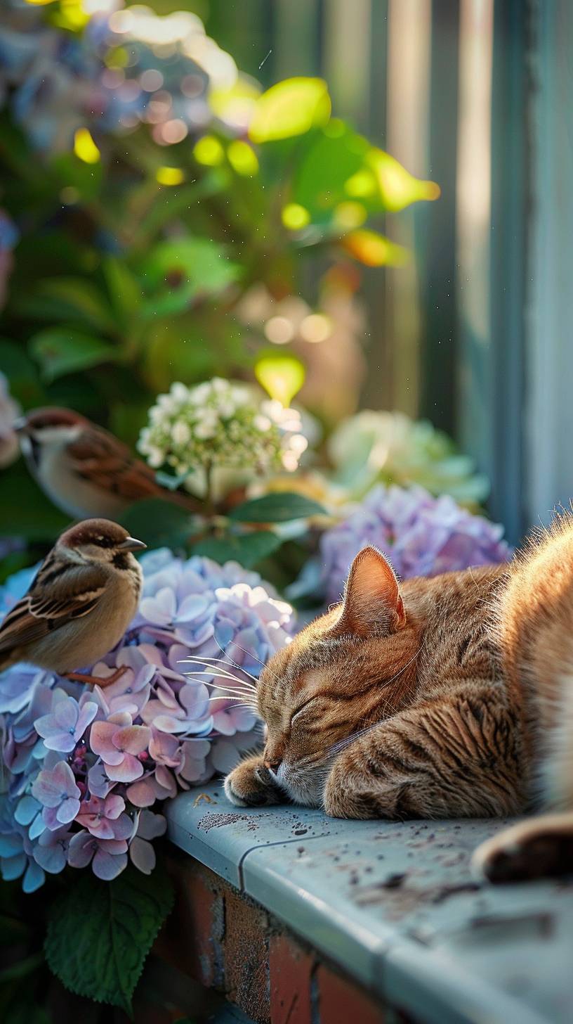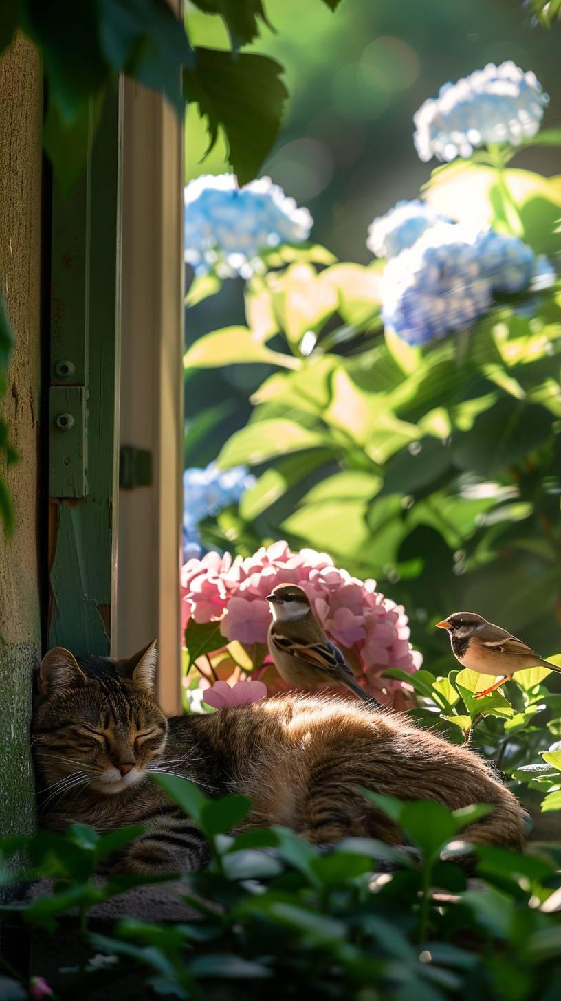Cat dozing on the porch, overall view of cat spreading hydrangea beyond the porch, two sparrows standing near the cat, colorful hydrangea on the diagonal left of the frame, garden greenery and colorful hydrangea, soft natural light, soft sunlight, especially vivid colors of hydrangea, details of sparrow feathers and cat fur are well expressed with warm light, Rule of Thirds awareness, a sparrow perches in the center of the hydrangea, the cat is slightly oblique, Canon EOS R5.