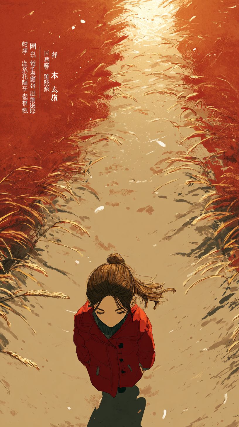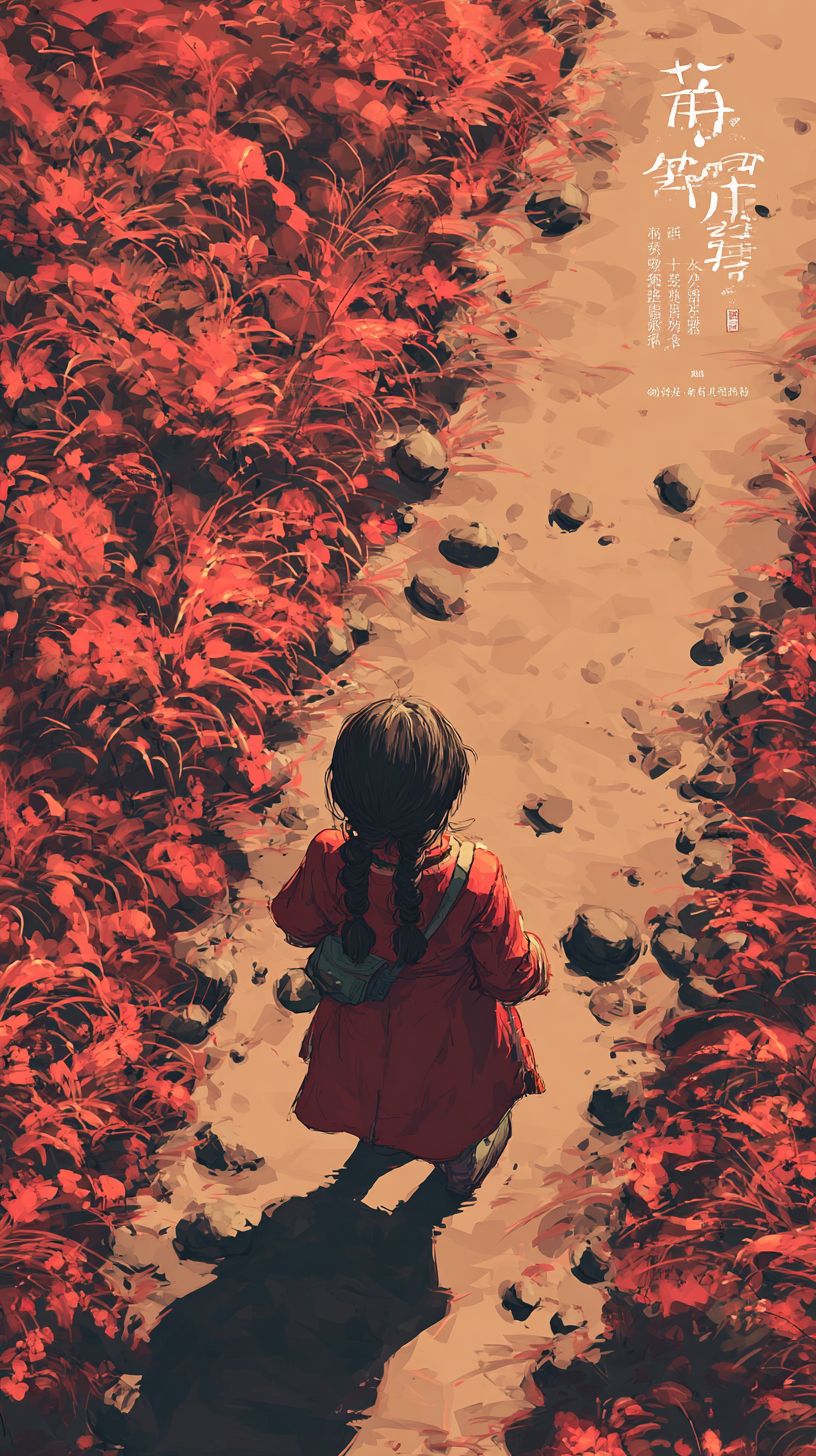 A girl in a red coat walks through a red sorghum field, leaving a triangular trail