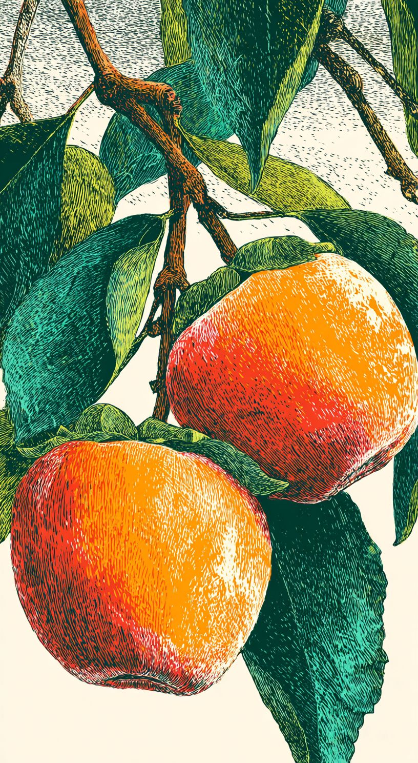 a close-up illustration of two persimmons hanging on a branch, with green leaves and orange colors, designed in the style of a woodcut print, with clear lines and textures. the background is white, highlighting details such as texture, patterned surface, and hand-drawn line strokes. it presents warm tones and rich color layers through traditional wood engraving techniques. this artwork has a strong contrast between light and dark, showcasing exquisite details. --ar 59:107