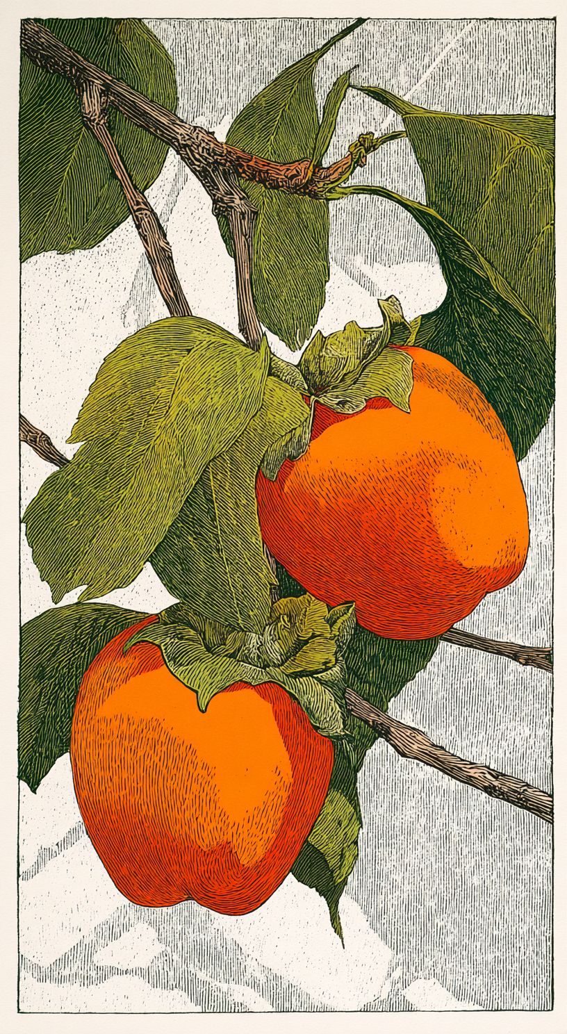 This is an illustration in woodcut style showing two persimmons hanging from a branch