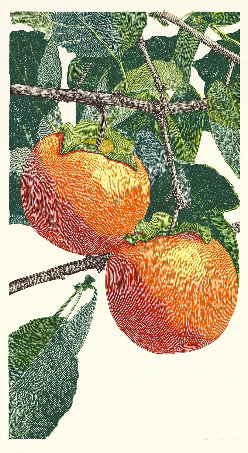 A close-up illustration of two persimmons hanging on a branch, with green leaves and orange colors, designed in the style of a woodcut print, with clear lines and textures. The background is white, highlighting details such as texture, patterned surface, and hand-drawn line strokes. It presents warm tones and rich color layers through traditional wood engraving techniques. This artwork has a strong contrast between light and dark, showcasing exquisite details.