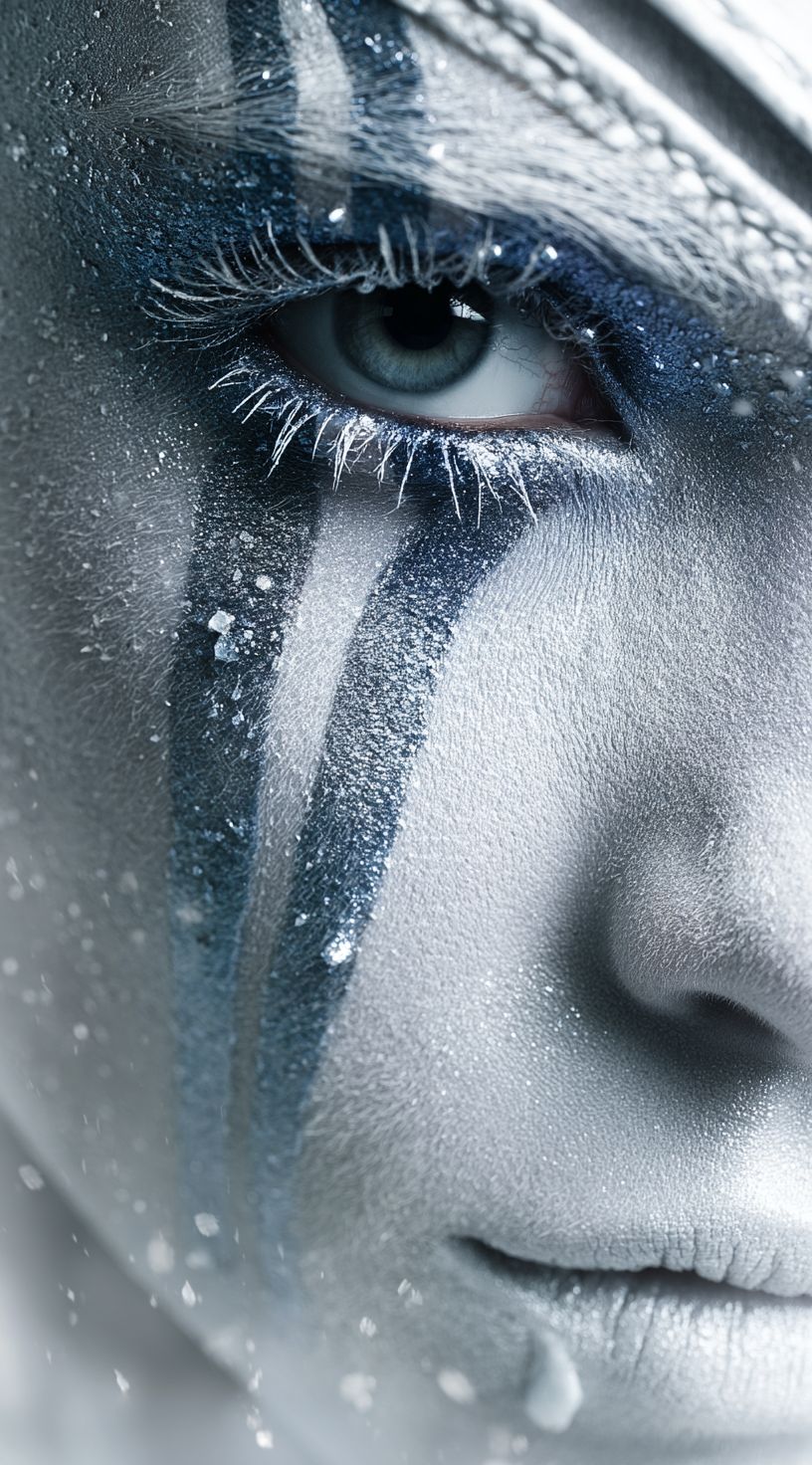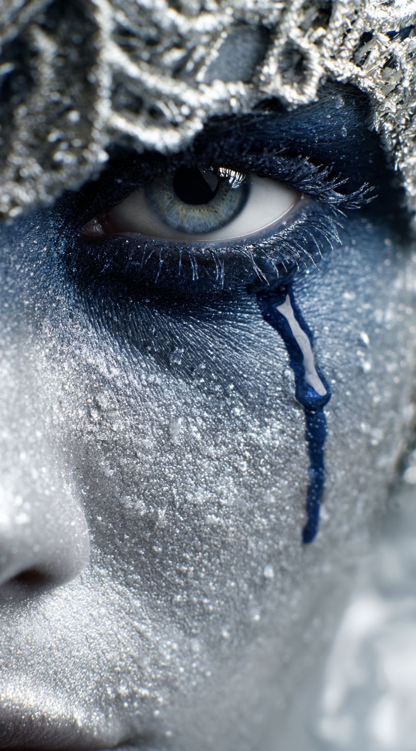 a close-up of an eye with silver and blue makeup, adorned in futuristic tribal attire, with tears dripping from the eyelids. the background is a monochromatic white canvas, creating a stark contrast that emphasizes her enigmatic expression. her face radiates power as she stands amidst an otherworldly environment, embodying elegance and mystery. --ar 71:128