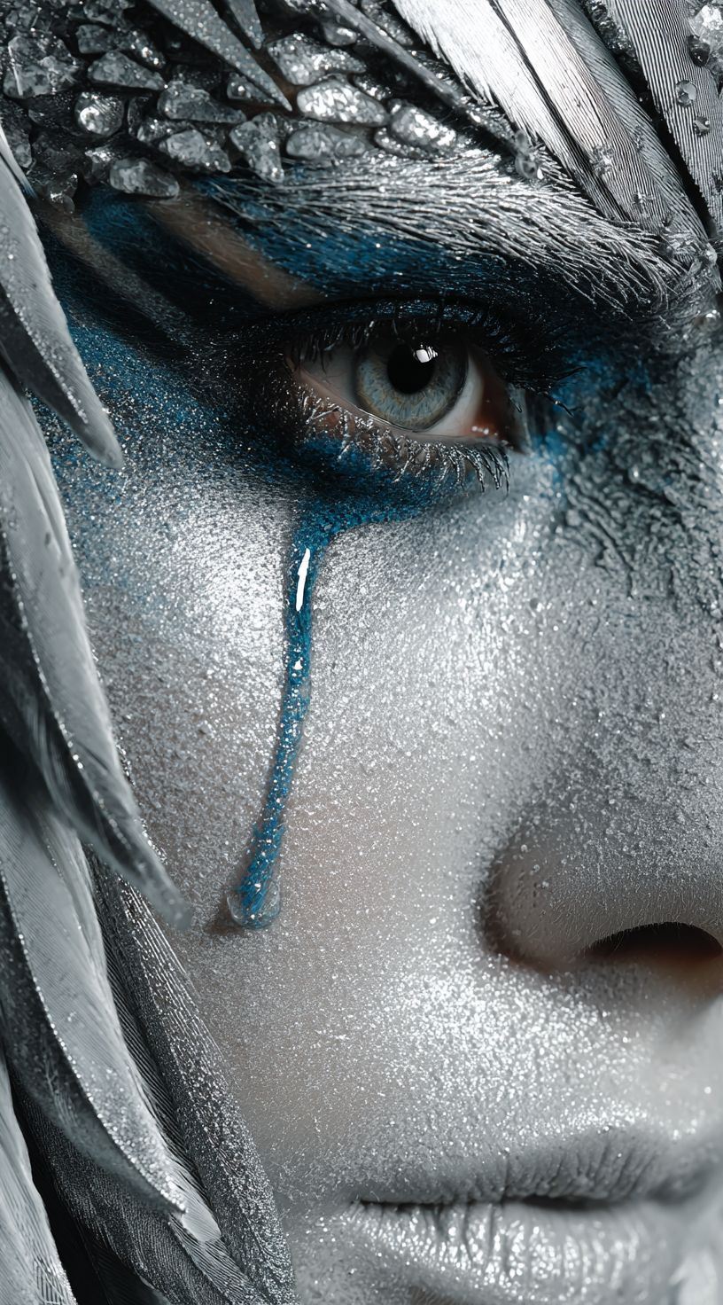 A close-up of an eye with silver and blue makeup, adorned in futuristic tribal attire, with tears dripping from the eyelids. The background is a monochromatic white canvas, creating a stark contrast that emphasizes her enigmatic expression. Her face radiates power as she stands amidst an otherworldly environment, embodying elegance and mystery.