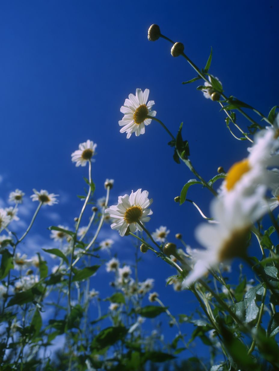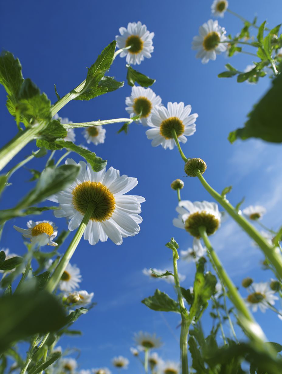 A fresh and bright landscape photo featuring white daisies growing towards the blue sky