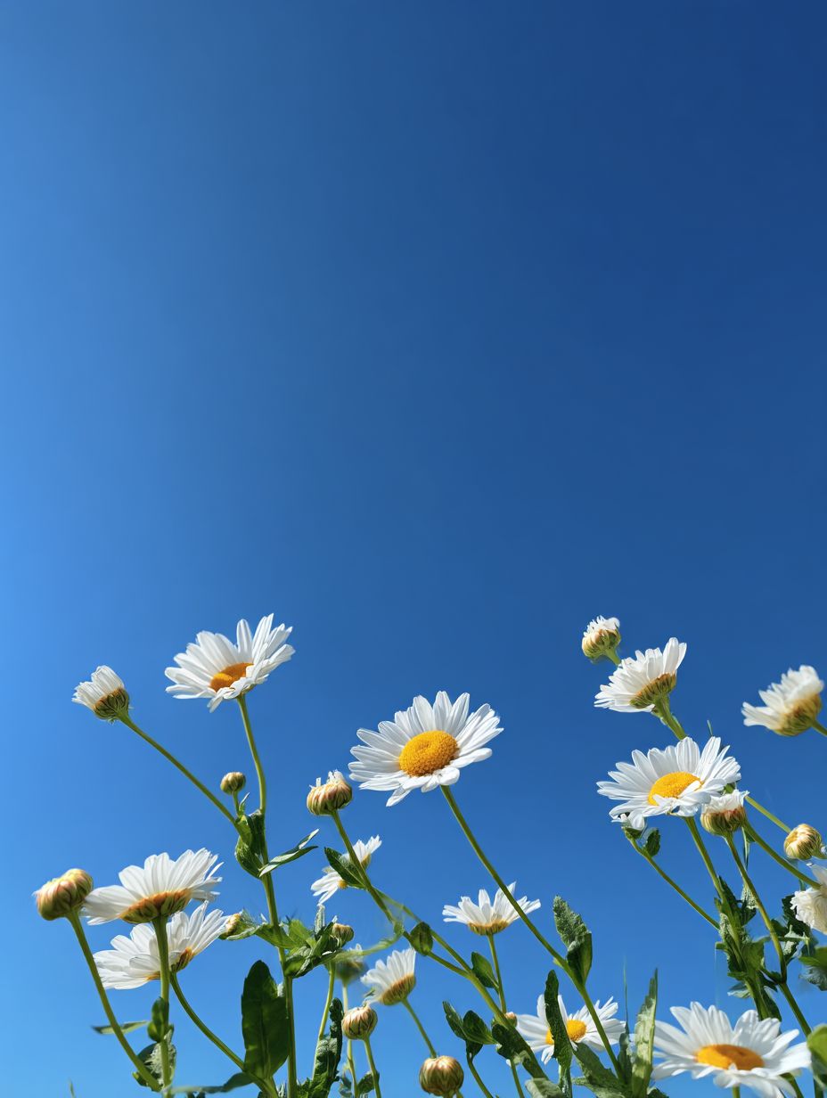 A realistic landscape photo from a low, upward angle. At the bottom of the composition are several small white daisies (with pure white petals, bright yellow centers, and fresh green stems and delicate leaves; some are in full bloom while others are still in bud), reaching upward toward the clear, deep-blue sky; the overall color palette is fresh and vibrant. --ar 3:4 --raw --profile ynth87l --stylize 50