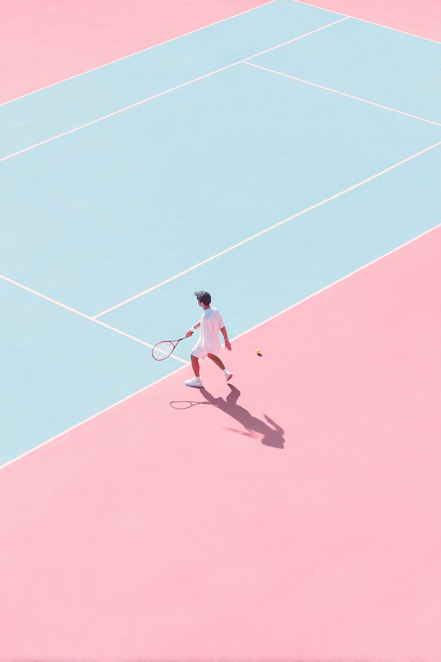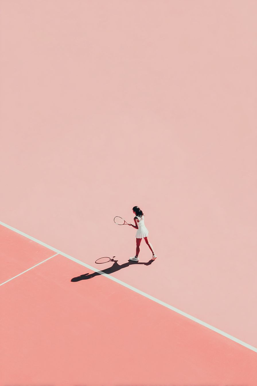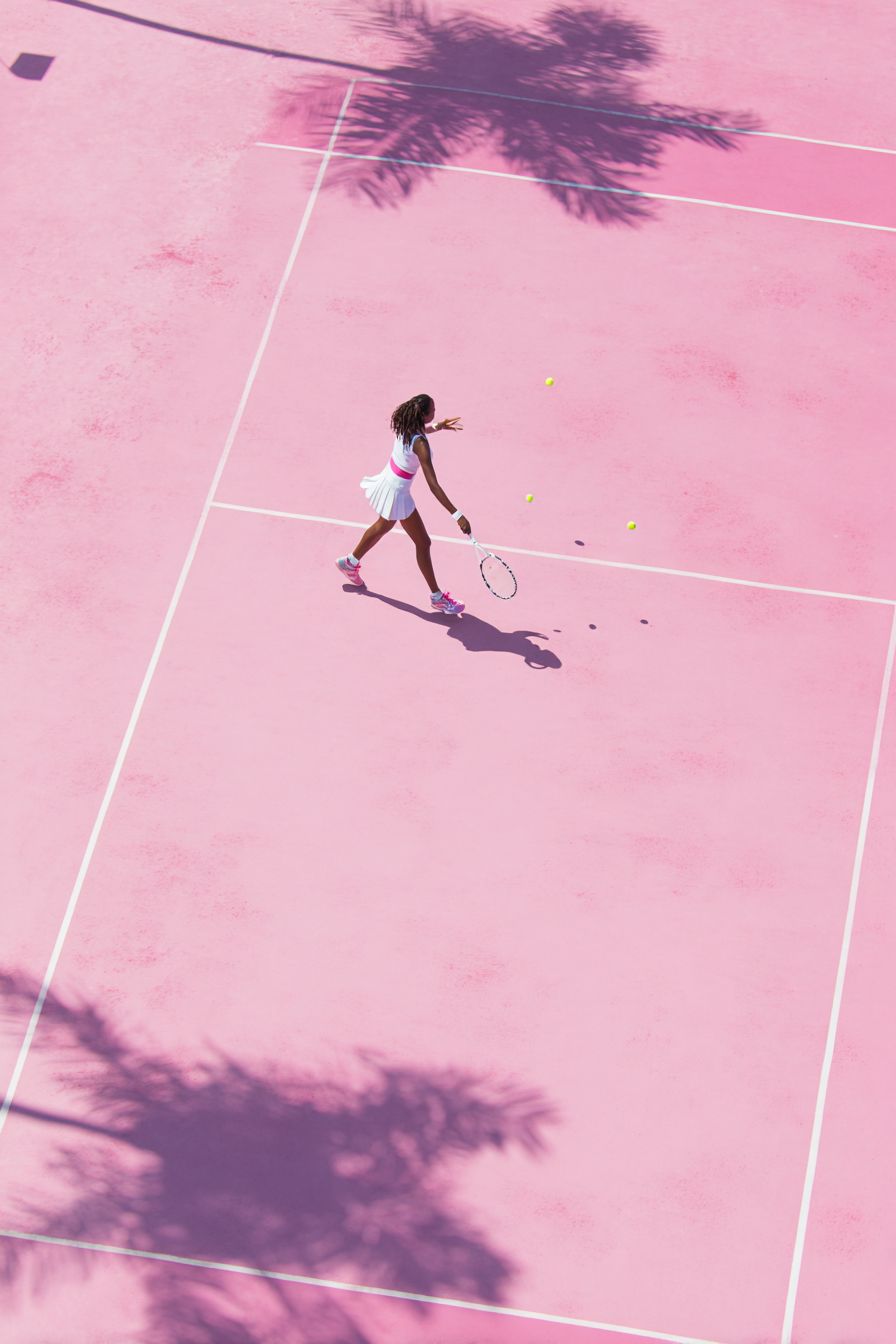 a tennis player playing on a pink grass court, --ar 2:3 --profile 51j1jnh --stylize 50
