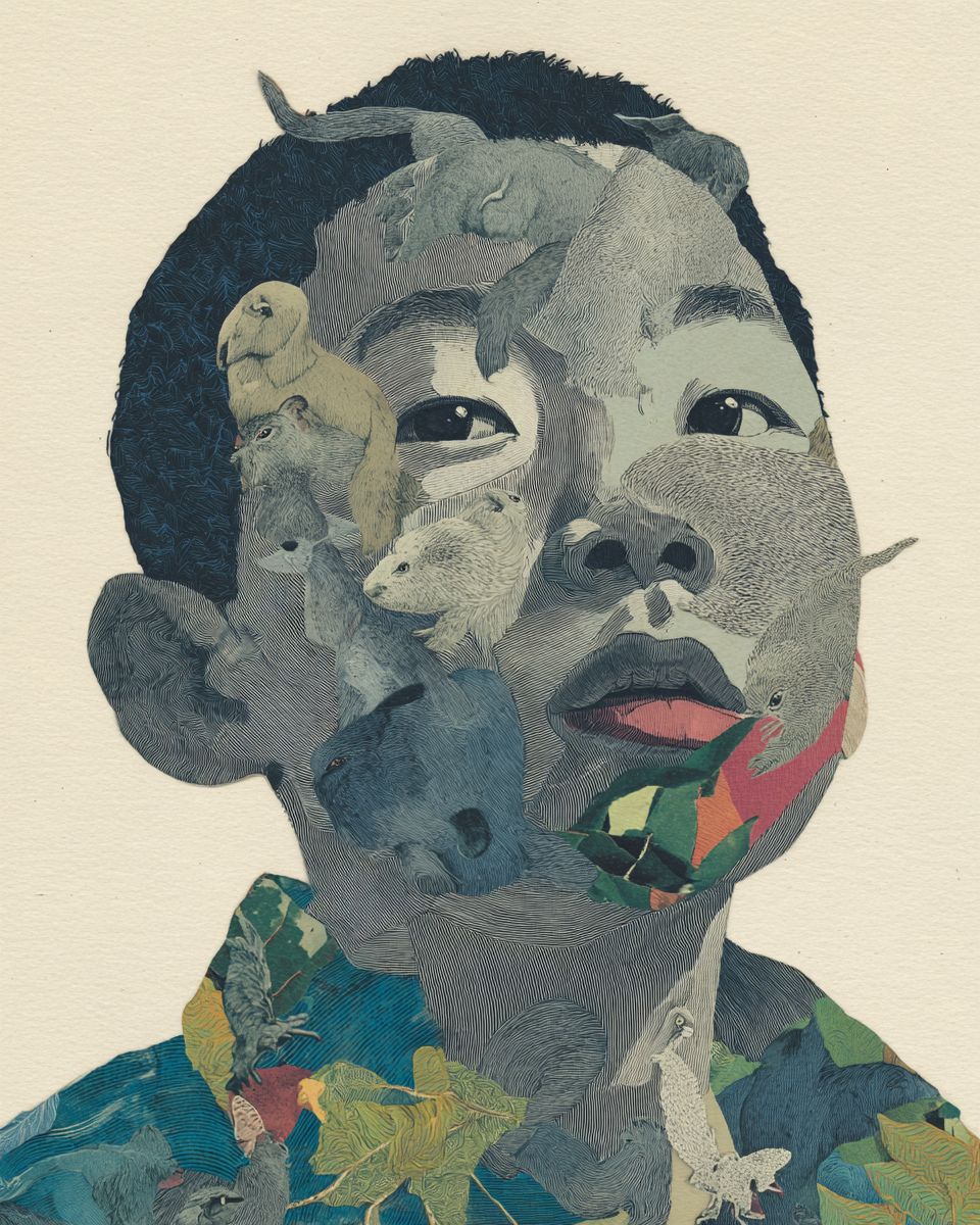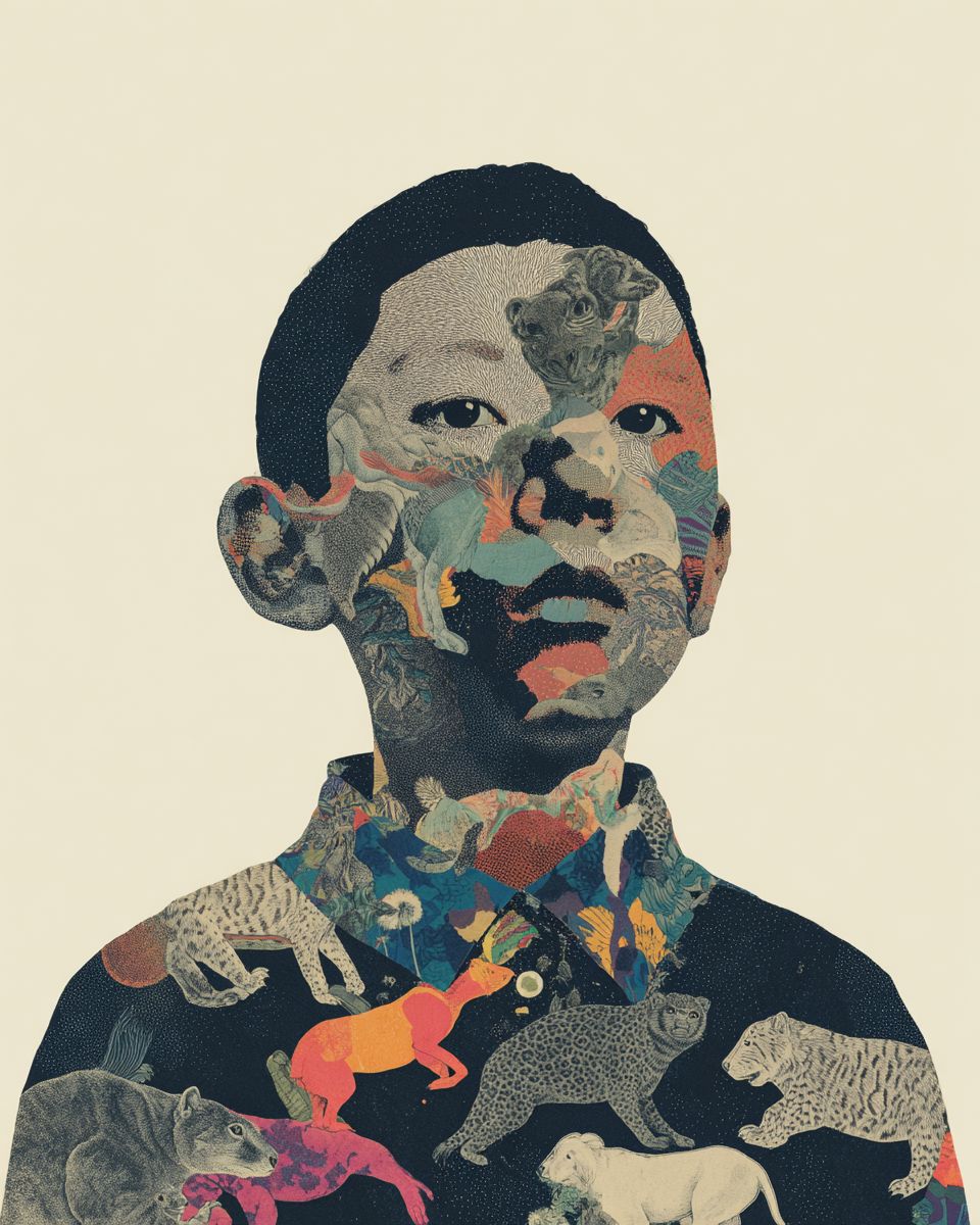 A young Asian boy's face is covered with various animal shapes in a surreal paper collage art style