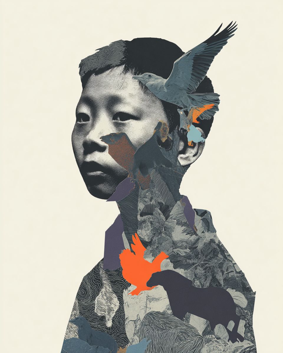 A young Asian boy's face is covered with various animal shapes, in a paper collage art style, with light white and dark gray tones, creating a surreal portrait with ghostly, translucent forms and bold colors, resulting in a haunting illustration.