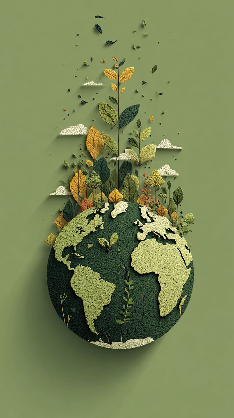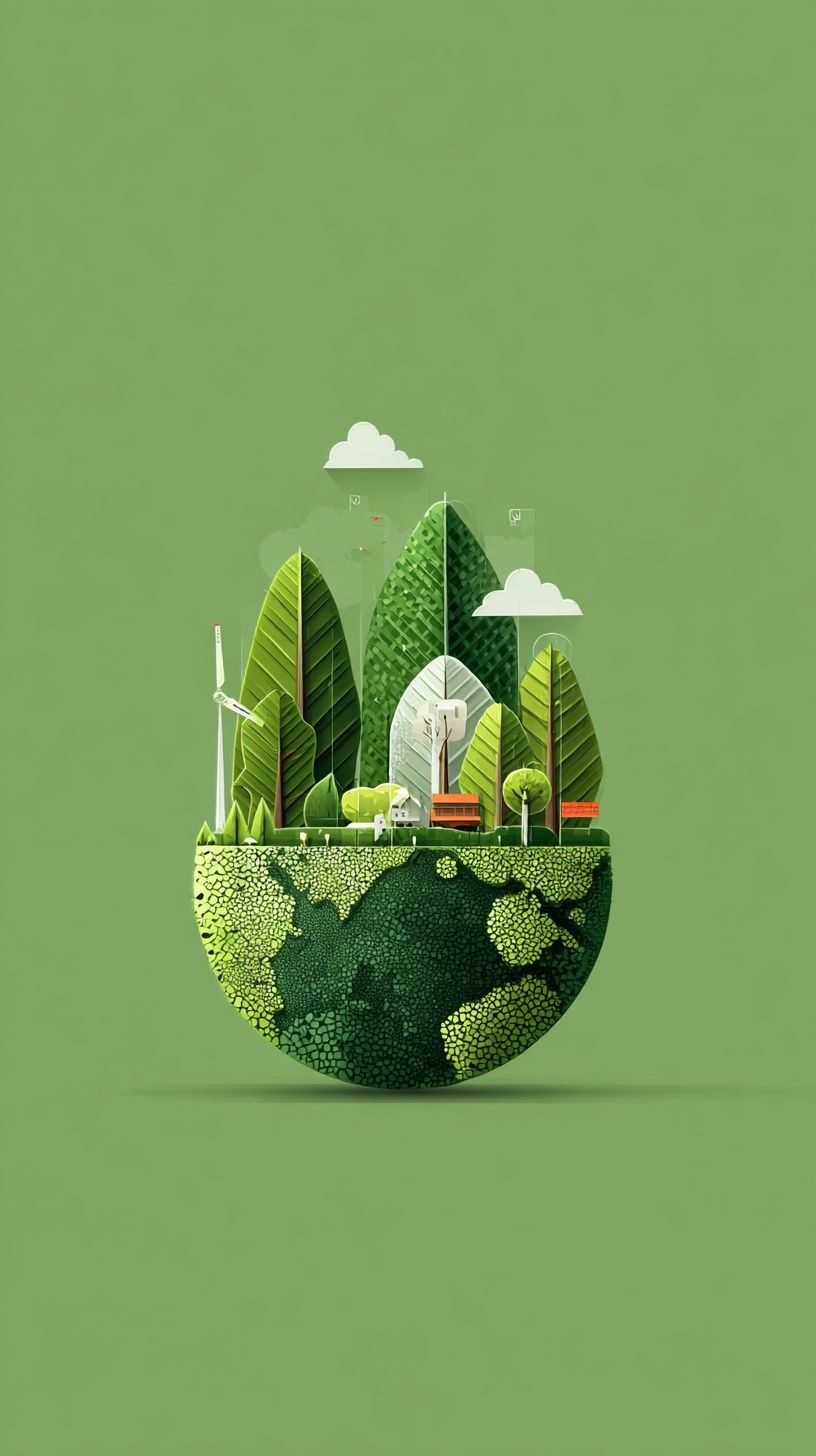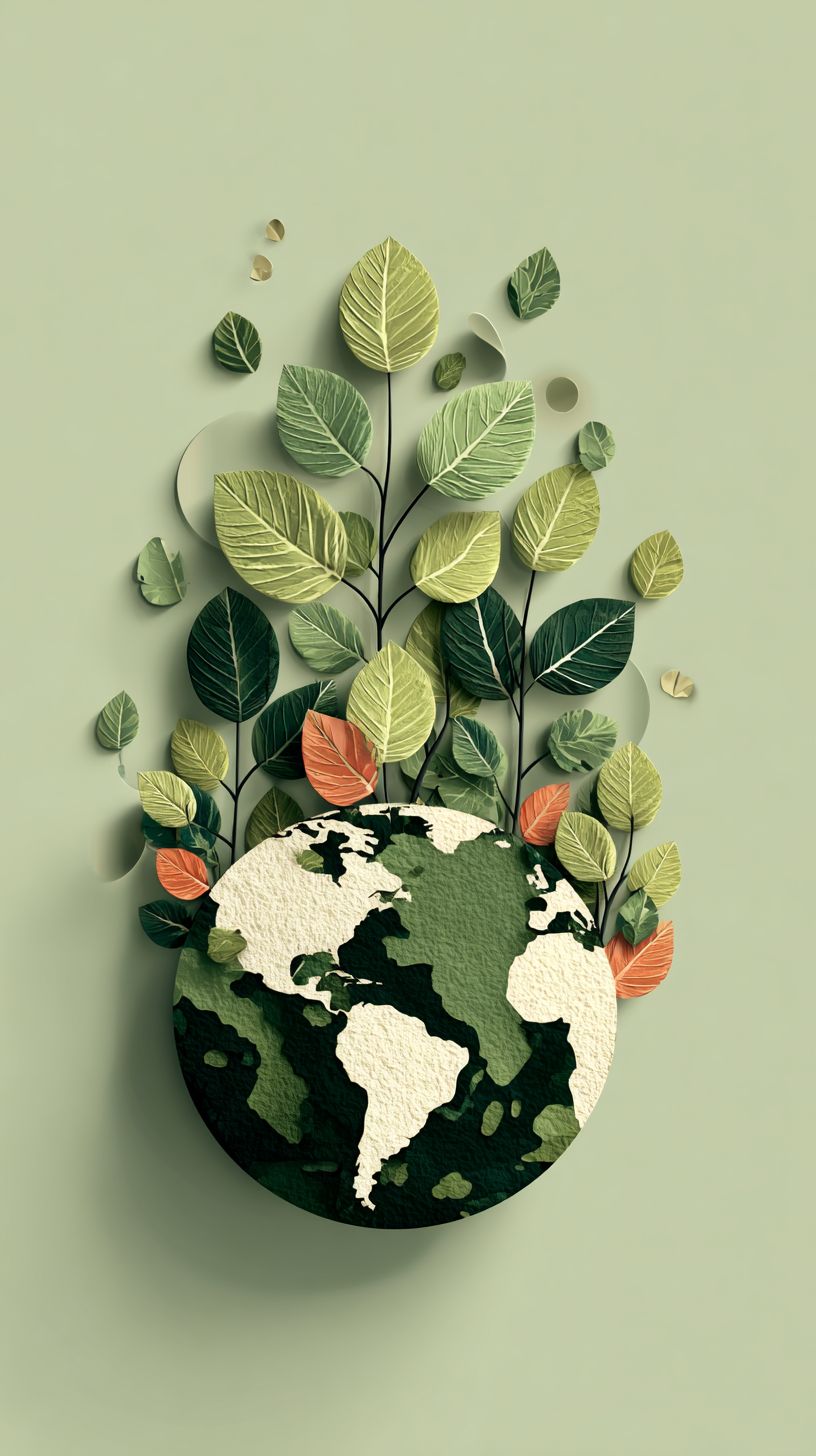 Flat vector illustration of planet Earth with leaves growing from it, minimal eco design on green background --chaos 20 --ar 9:16 --stylize 300