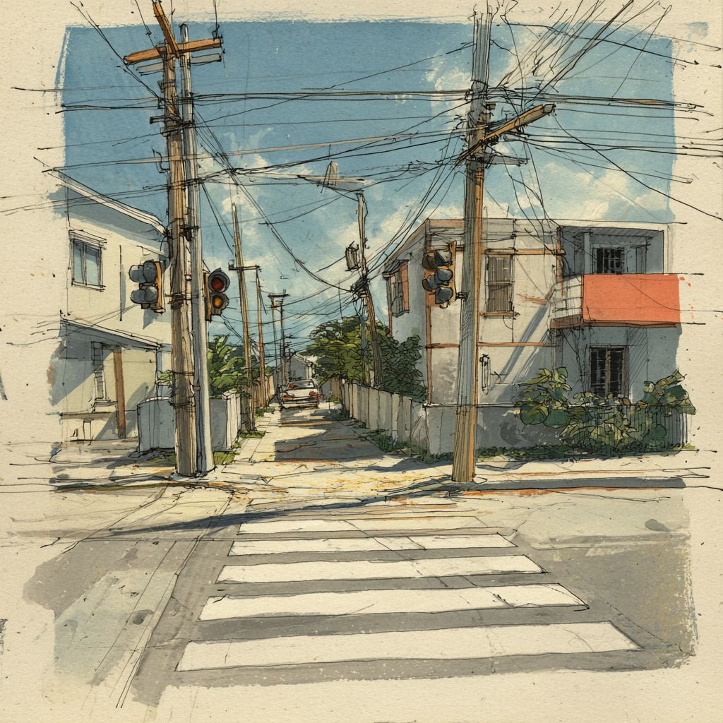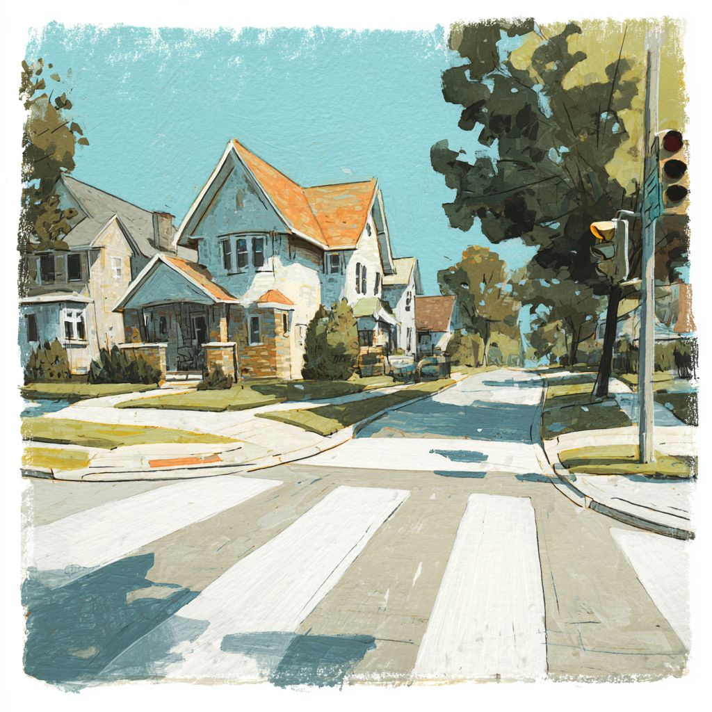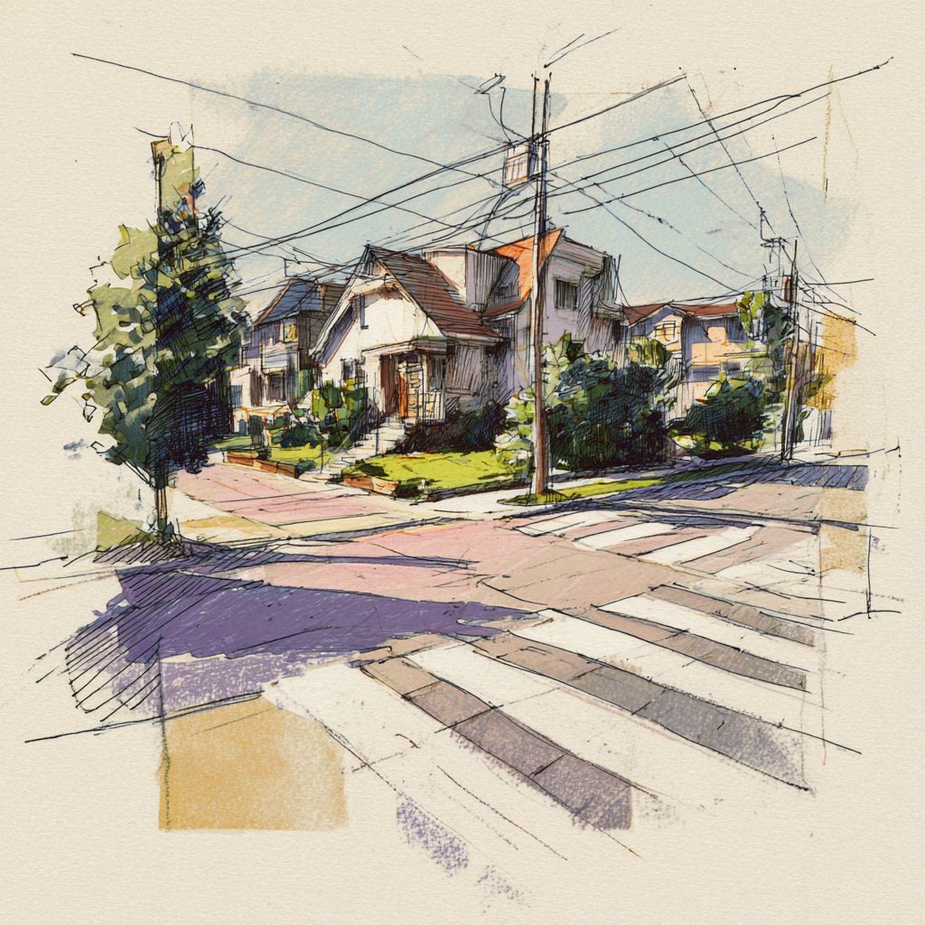gouache and colored pencil illustration of a cross walk in a neighborhood, off-white paper texture, soft muted pastel colors, loose hand-drawn lines