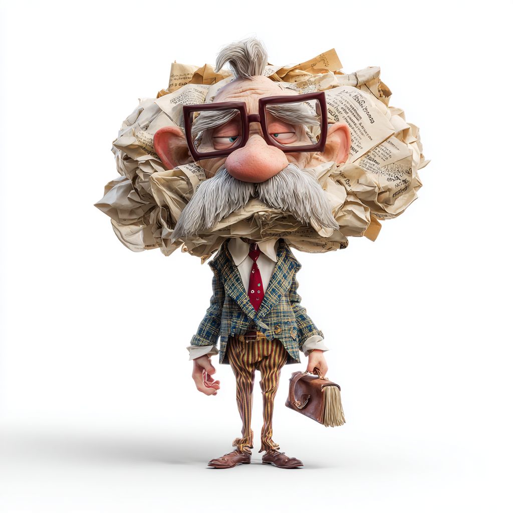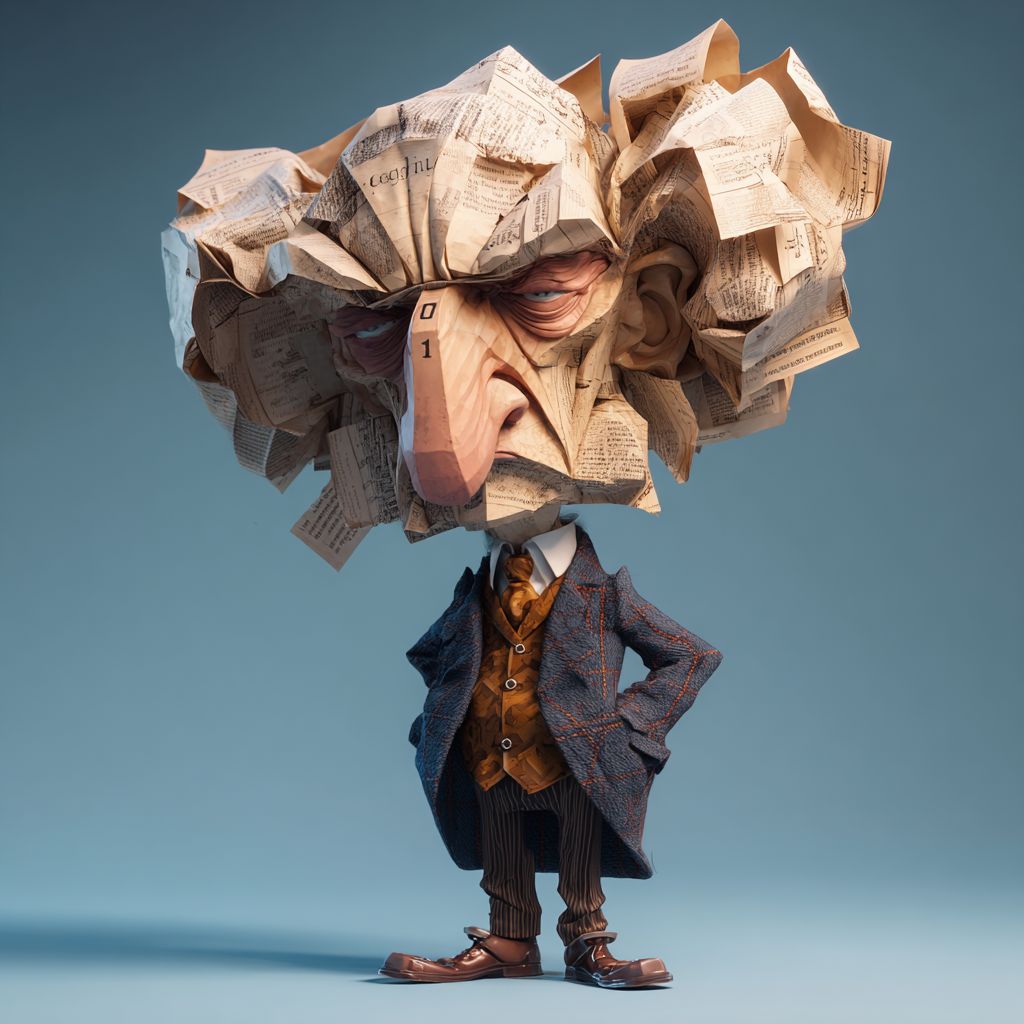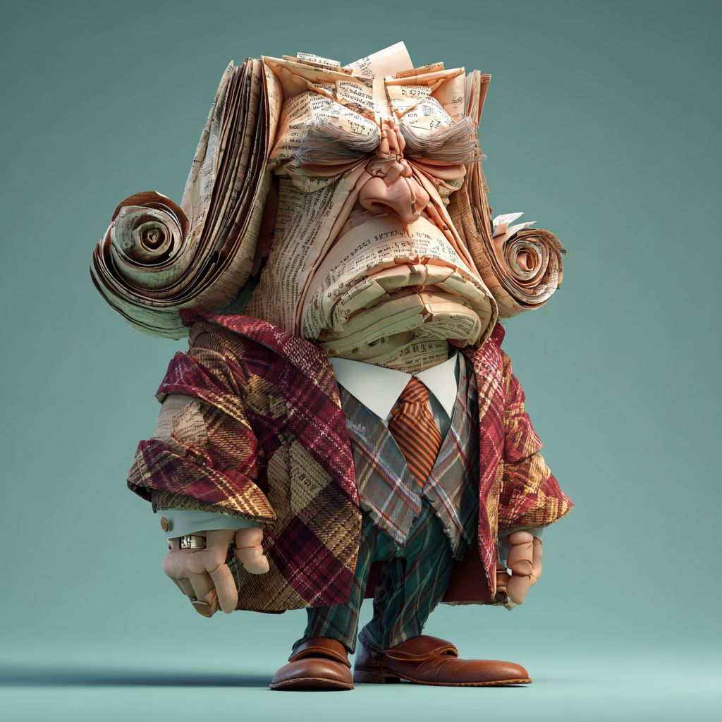 a full-body 3D caricature character, crumpled paper texture, oversized head, pretentious British lawyer in argyle suit, 9:16