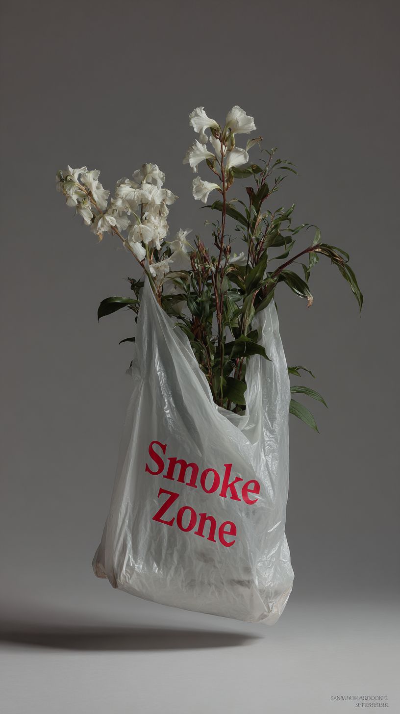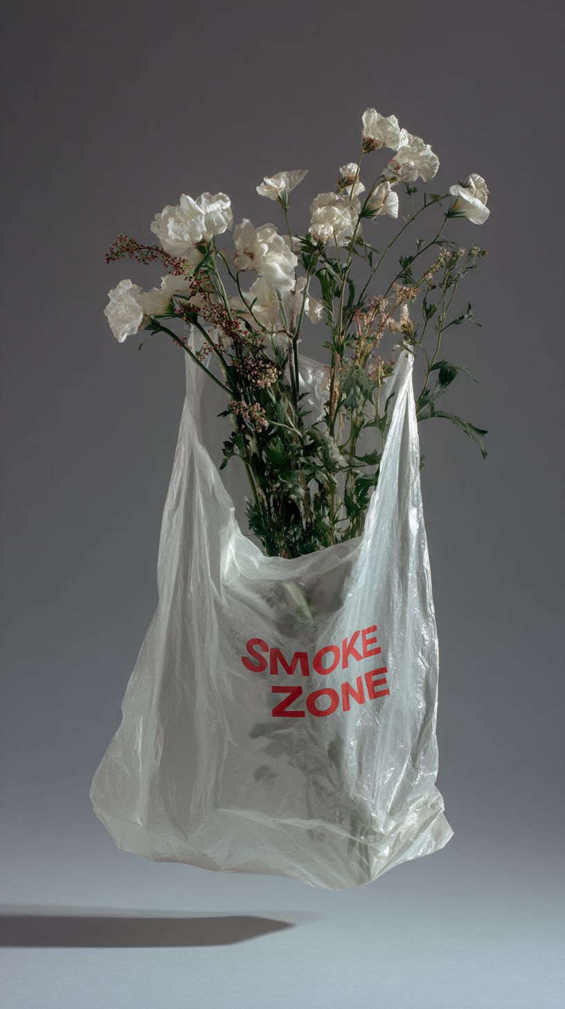 Studio photography of a floating plastic shopping bag, centered composition, mid-gray plain background, soft balanced contrast, minimal shadows, with flowers inside, with the word "Smoke Zone" printed on it in big red typography, soft lighting, high detail, realistic texture, editorial style --ar 9:16 --raw --profile 2z1dcoz