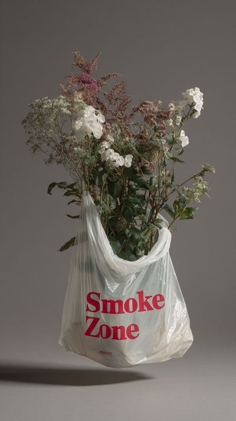 A floating plastic shopping bag with flowers inside and the word 'Smoke Zone' printed in big red typography