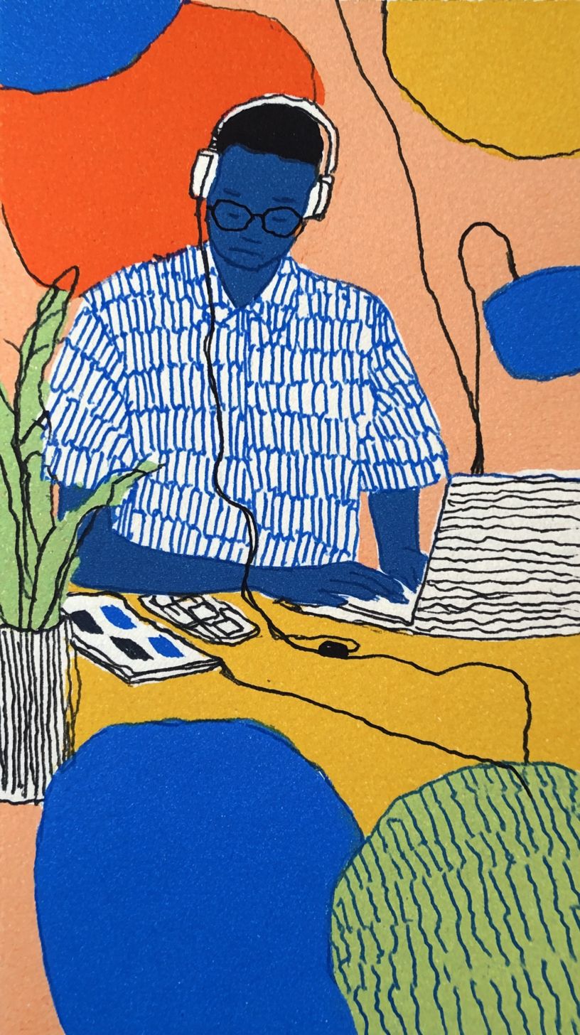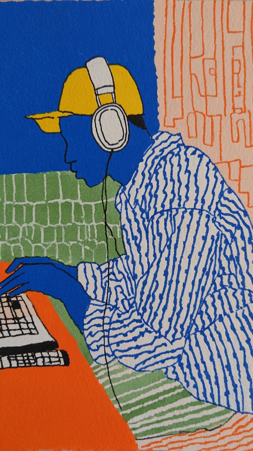man is listening to music and typing on laptop --ar 9:16 --sref 4009663077 448508314 --profile 7ow3vz8