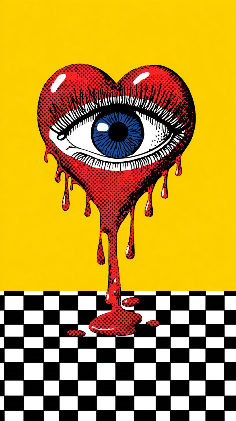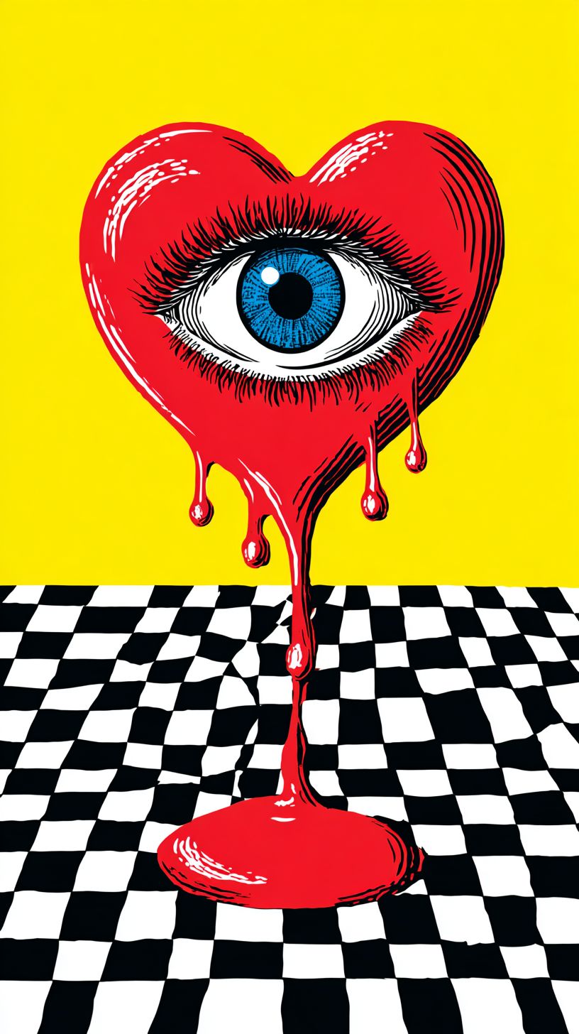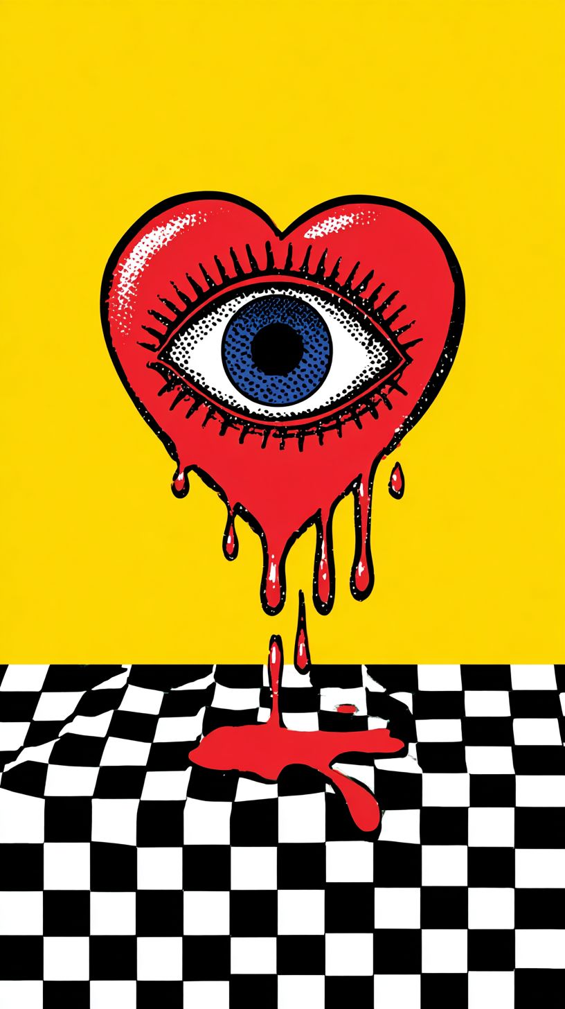 pop art style image of a melting red heart with an eye centrally placed. the eye has a blue iris and black pupil, surrounded by white, with black eyelashes on top. the background is split horizontally, with a vibrant yellow top half and a monochrome black and white checkerboard bottom half. the red heart extends from the yellow portion, dripping onto the checkerboard design below. --ar 9:16