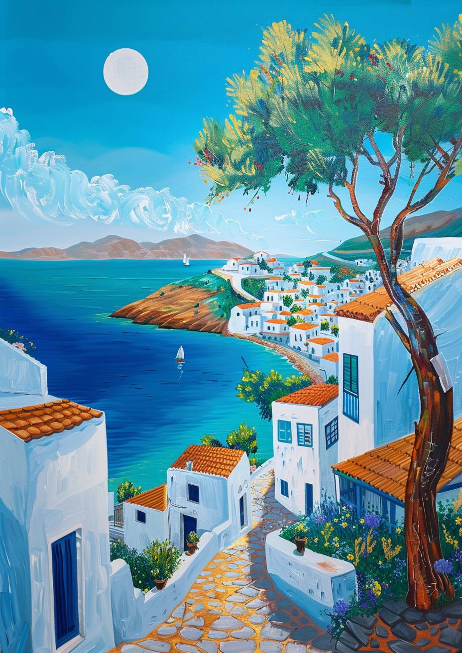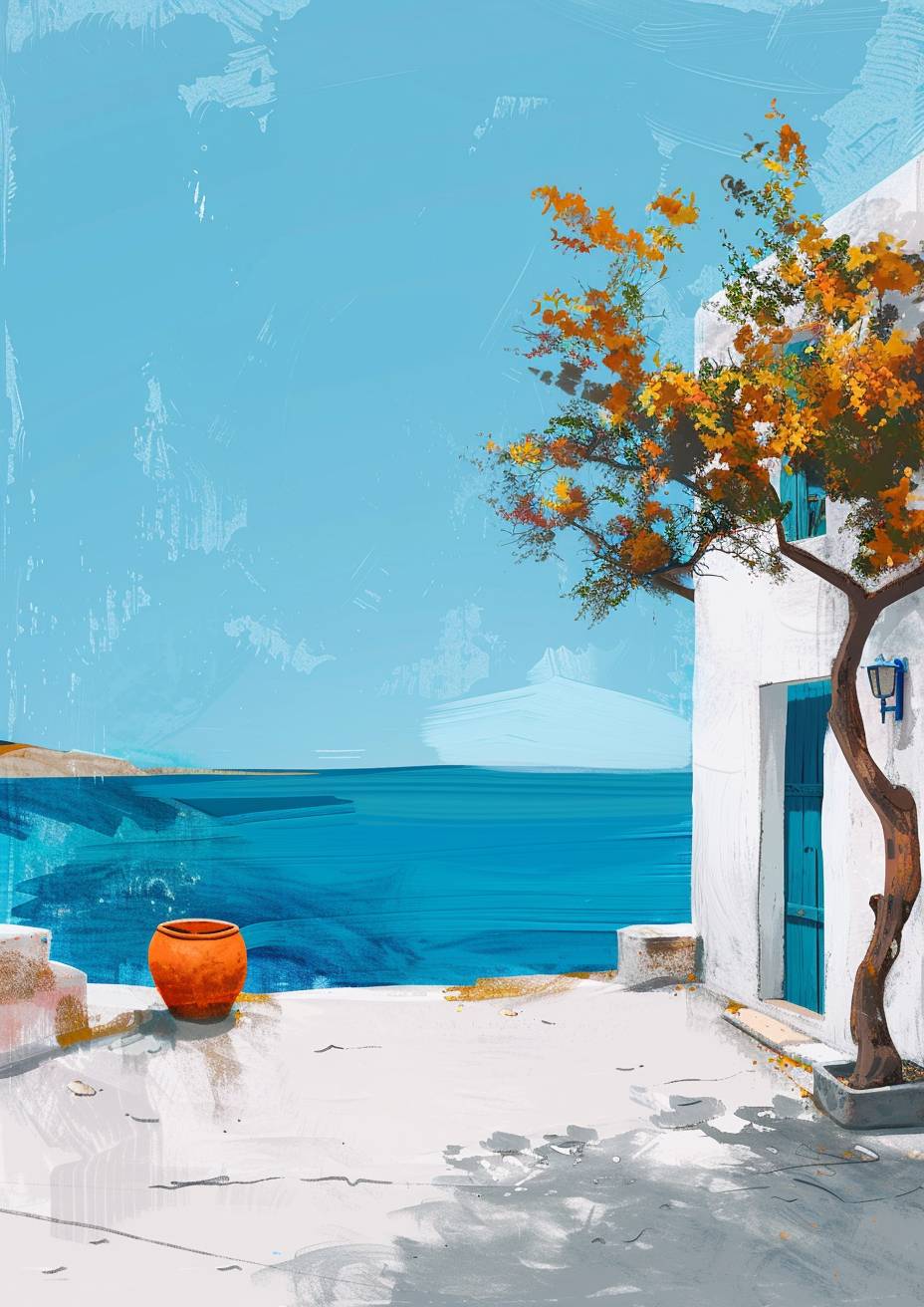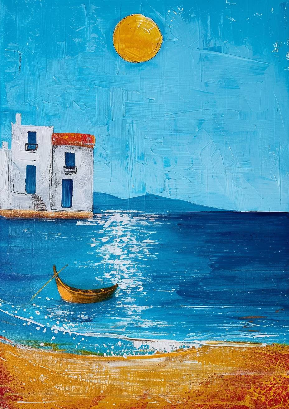 This is a Greek artistic painting depicting Aegean summer in a bohemian modern minimal style with lots of empty space.