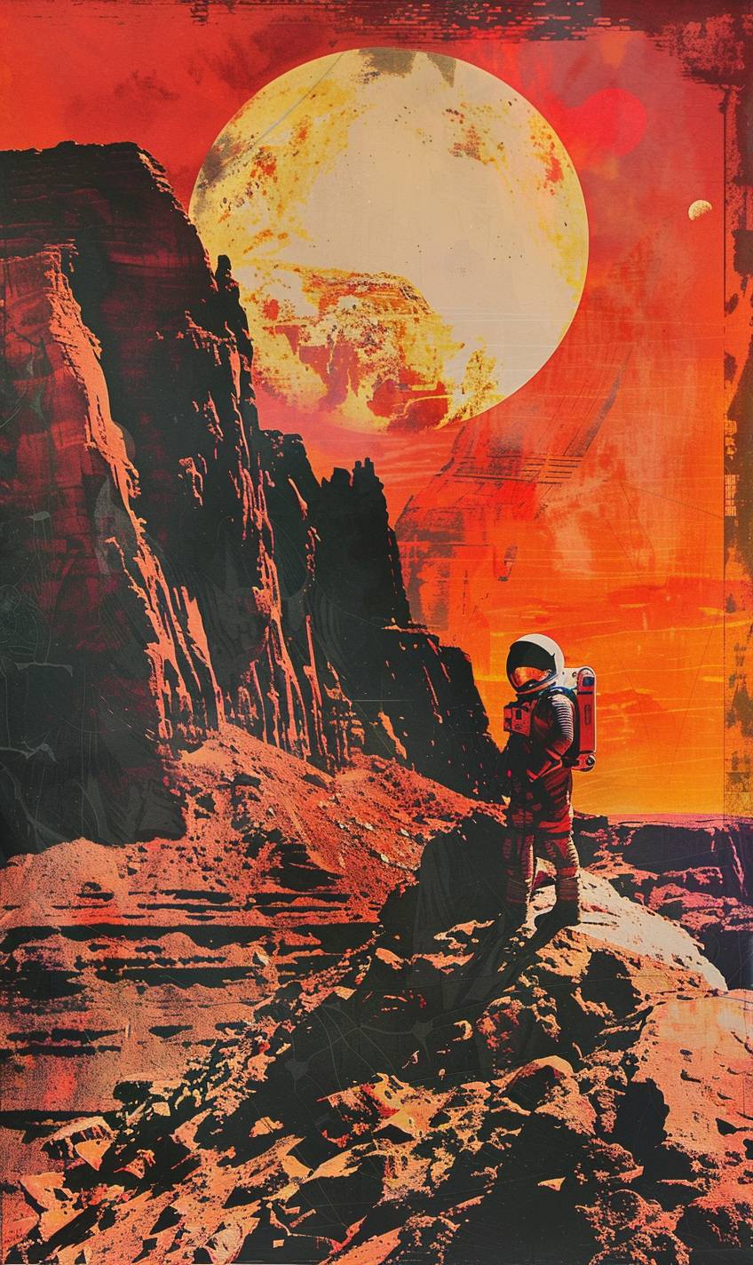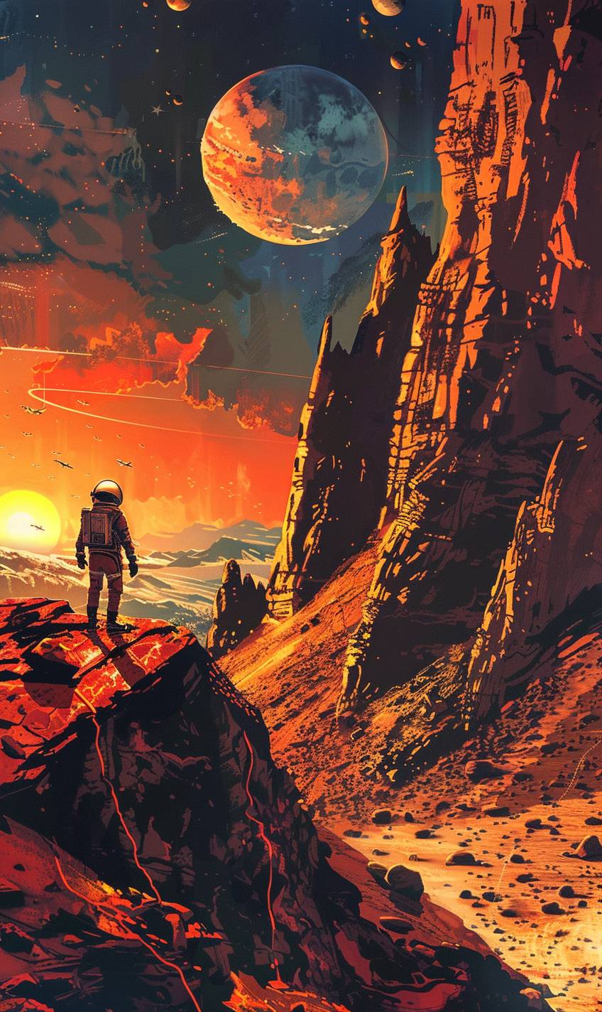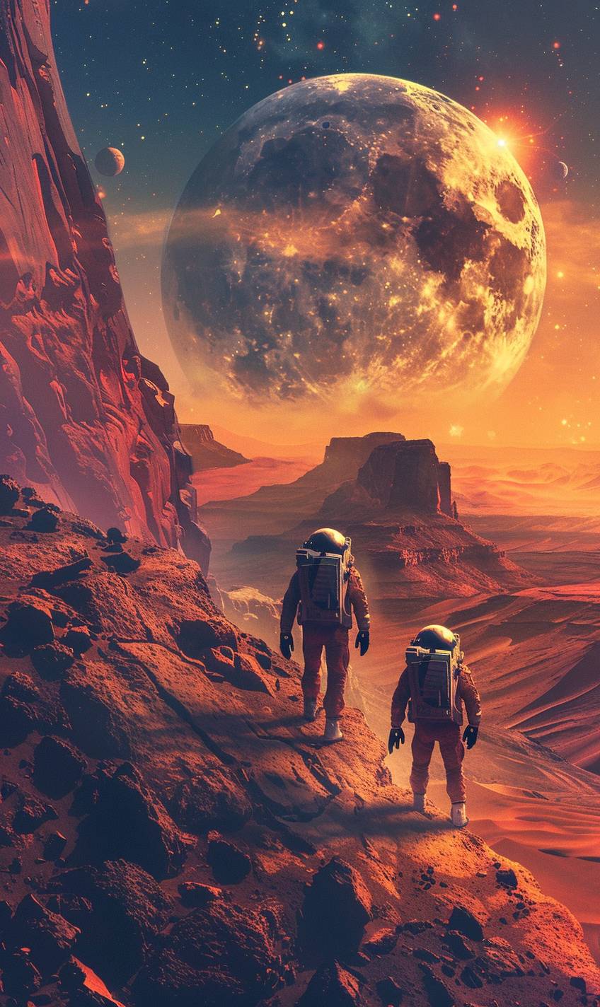 Astronauts on Mars, red alien landscape, massive sunset, giant planets in sky, steep rock formations, reflective visors, space exploration, high contrast, digital art, vivid colors, long shadows, solitary, serene, hyper-realistic watercolor painting, graphic novel style --ar 3:5 --v 6.0