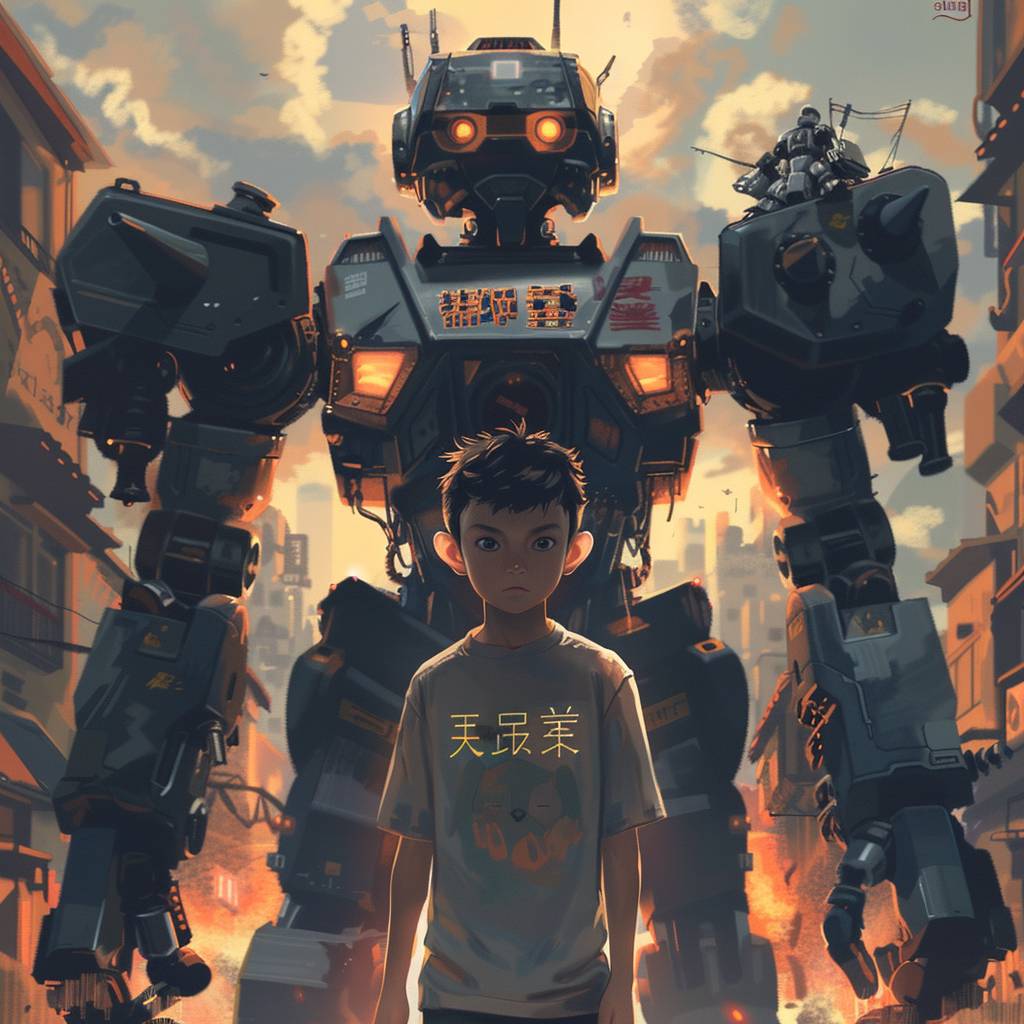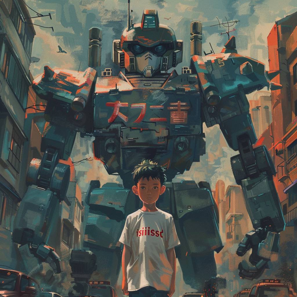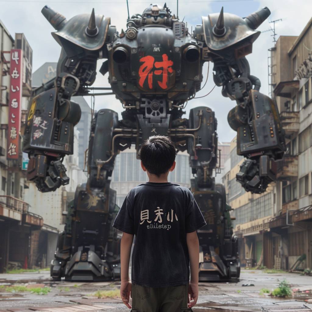 A confident boy stands in front of a massive mecha robot, his t-shirt embroidered with 'ロボット', captured in a low-angle shot emphasizing the size and power of the mecha.