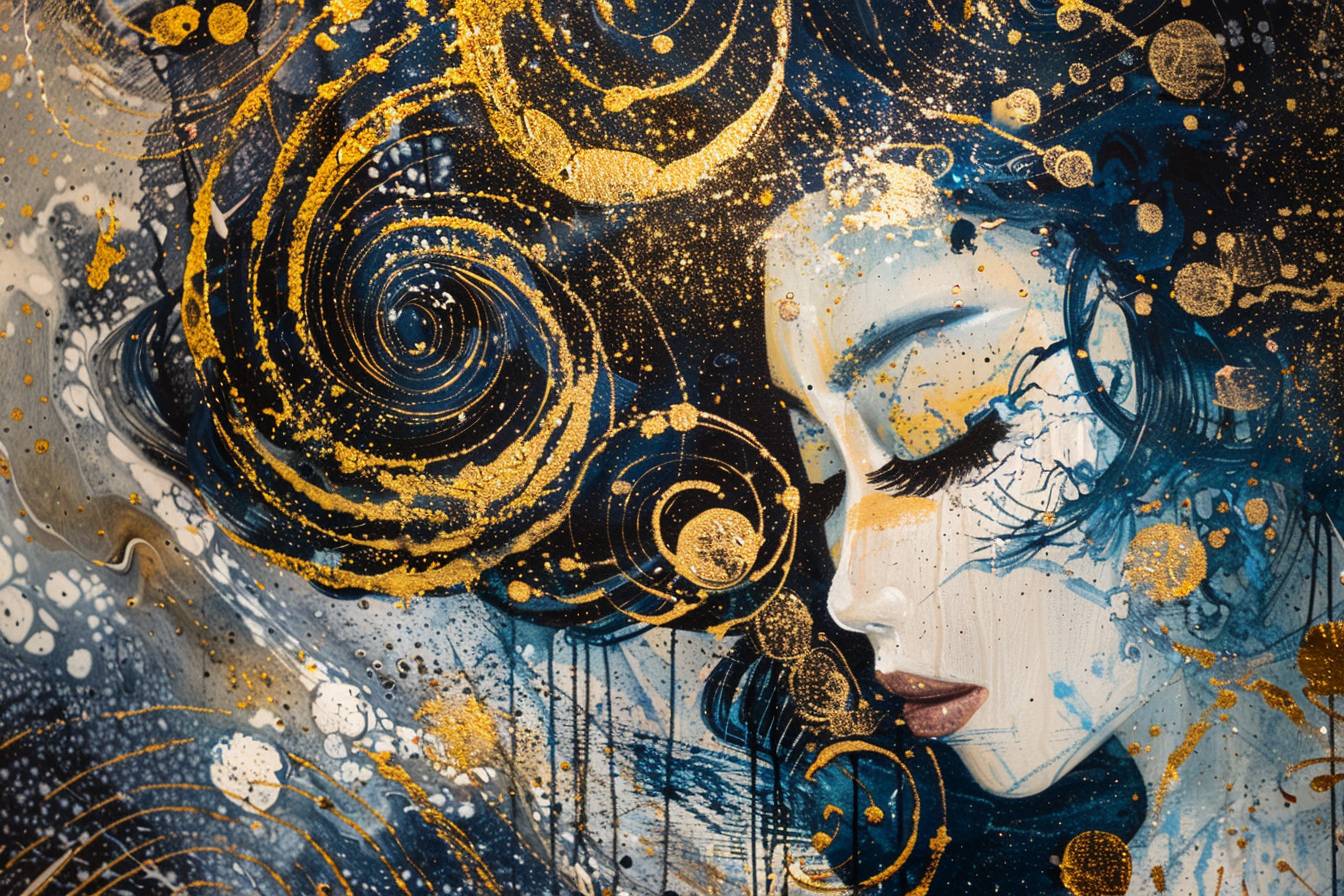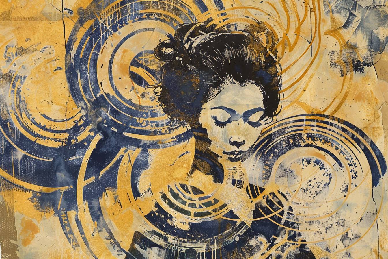 A geisha captured in abstract art, featuring swirling gold and indigo patterns.