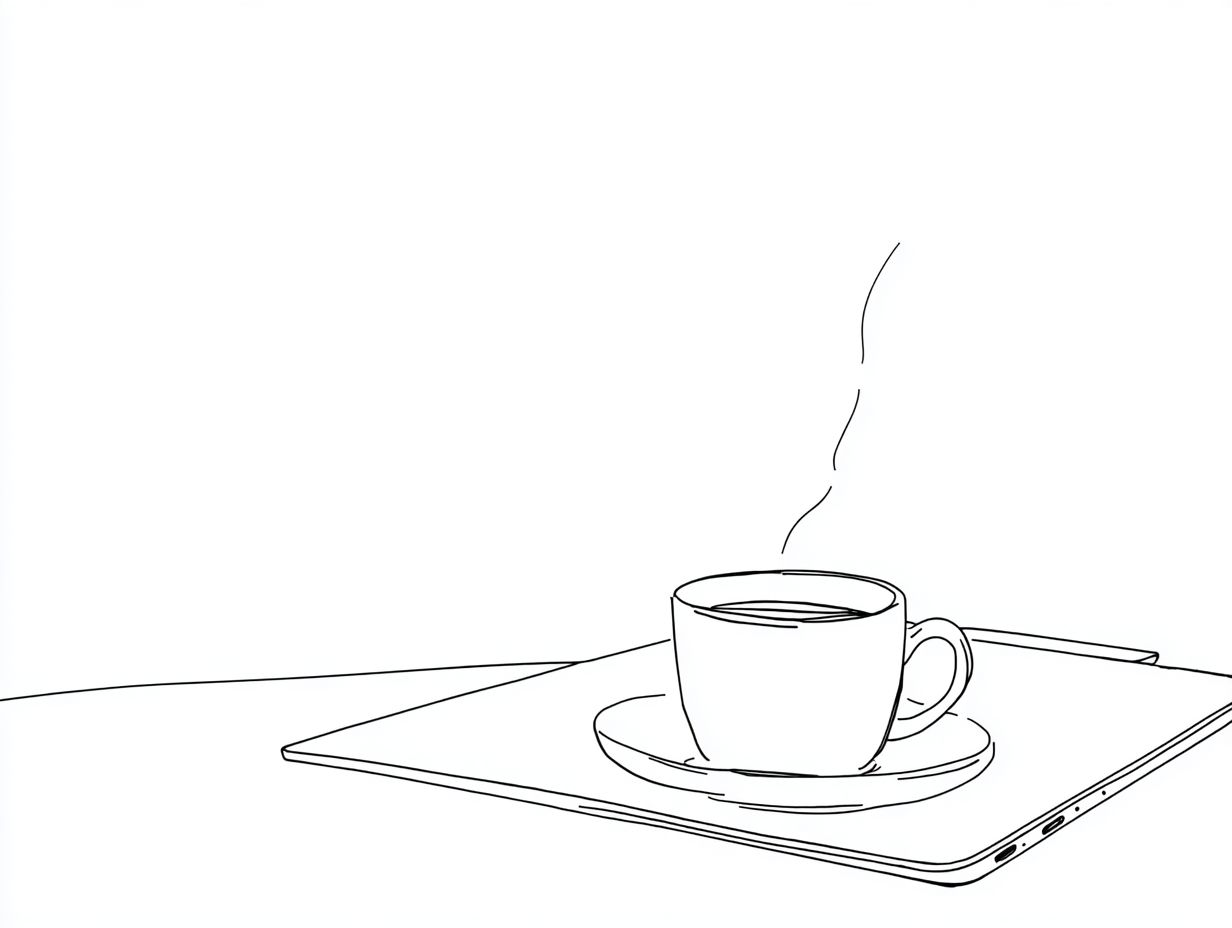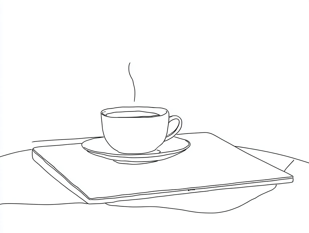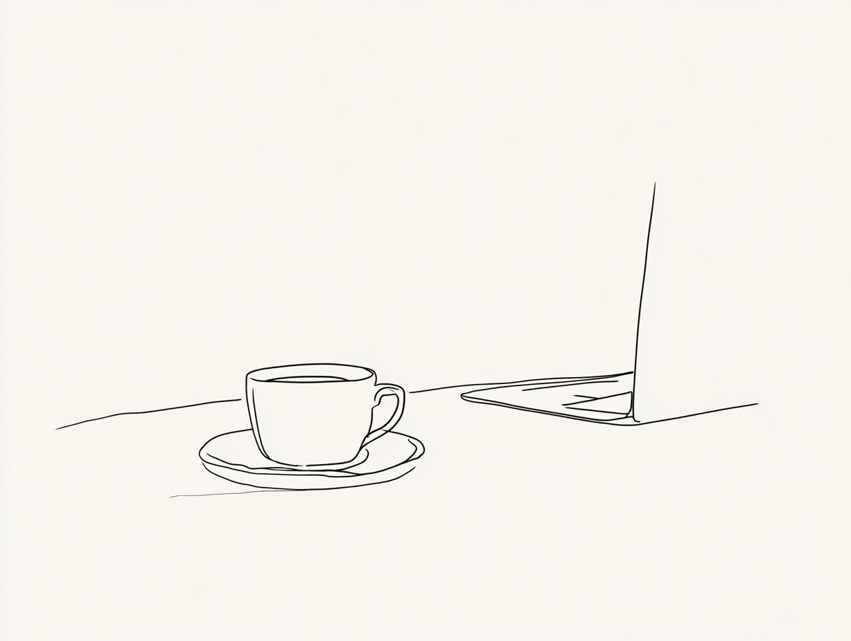 very minimal black and white line illustration of a simple coffee cup on a table next to a closed laptop, no people, calm and balanced composition, thin clean linework with slight irregularity, no shading, no crosshatching, no texture, flat editorial style, simple geometric shapes, lots of negative space, white background --ar 4:3 --raw --profile yzfi5yz --stylize 40
