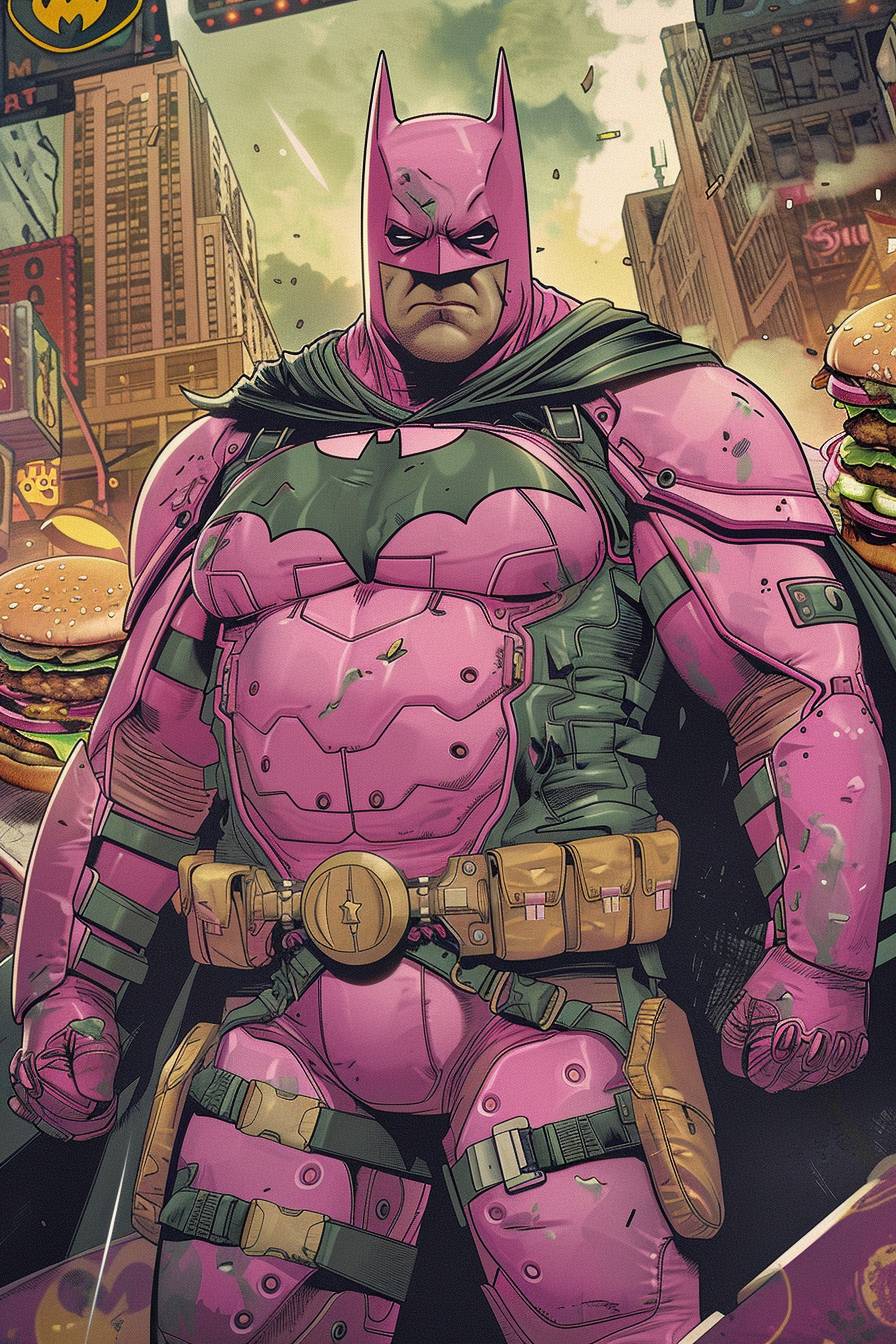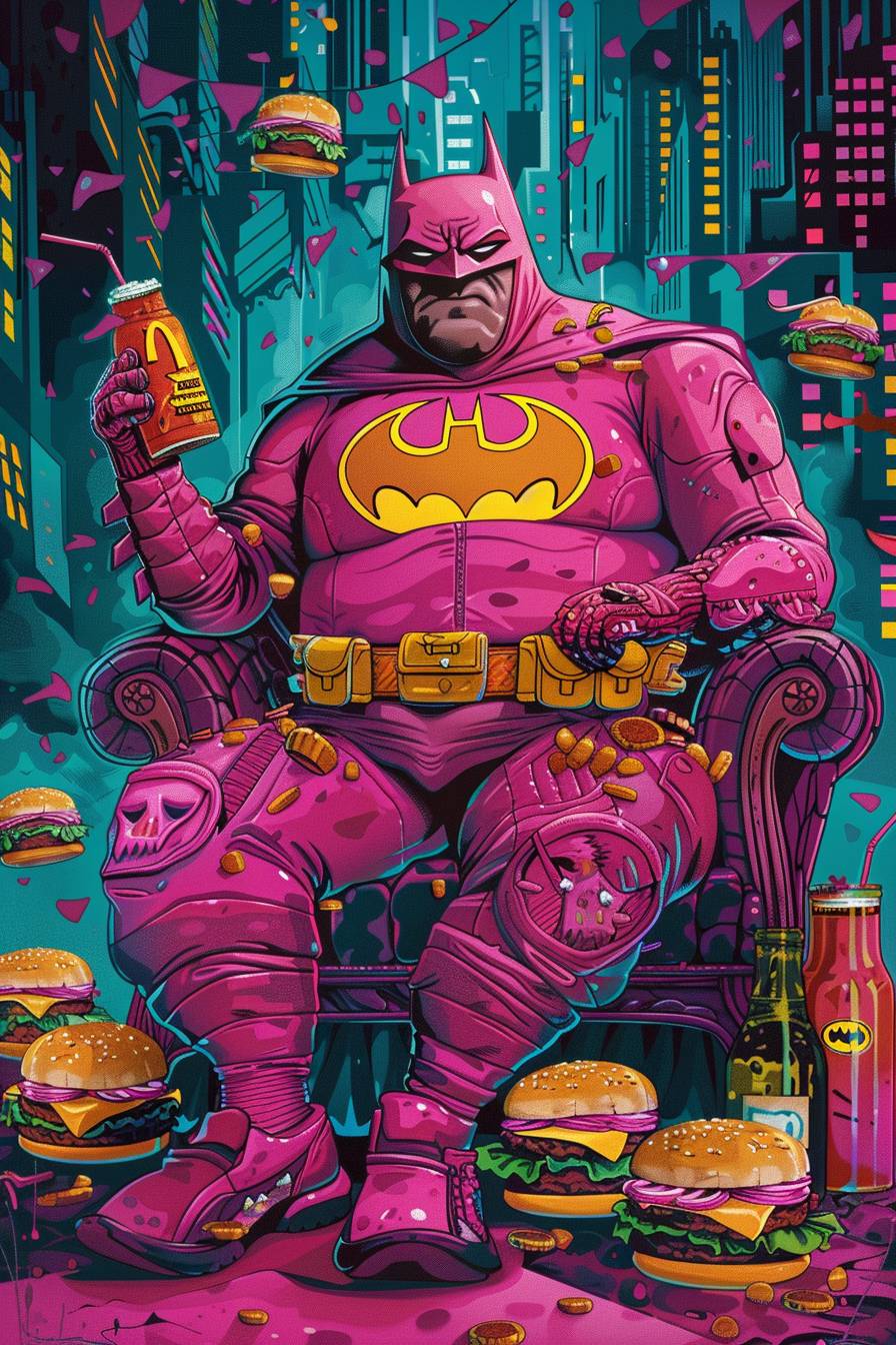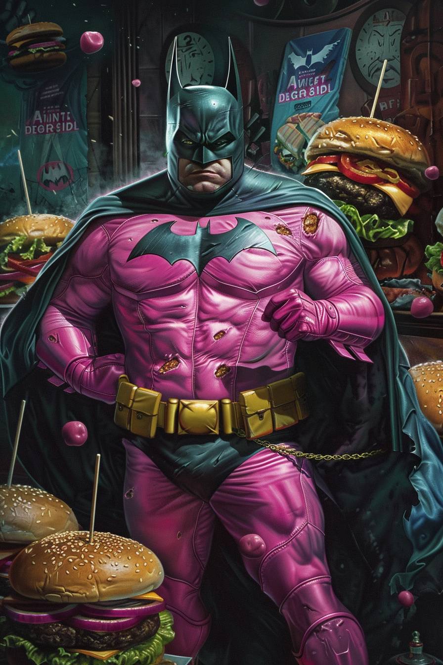 Fat Batman in a pink suit with a complicated poster featuring lots of burgers in the background, highly detailed.