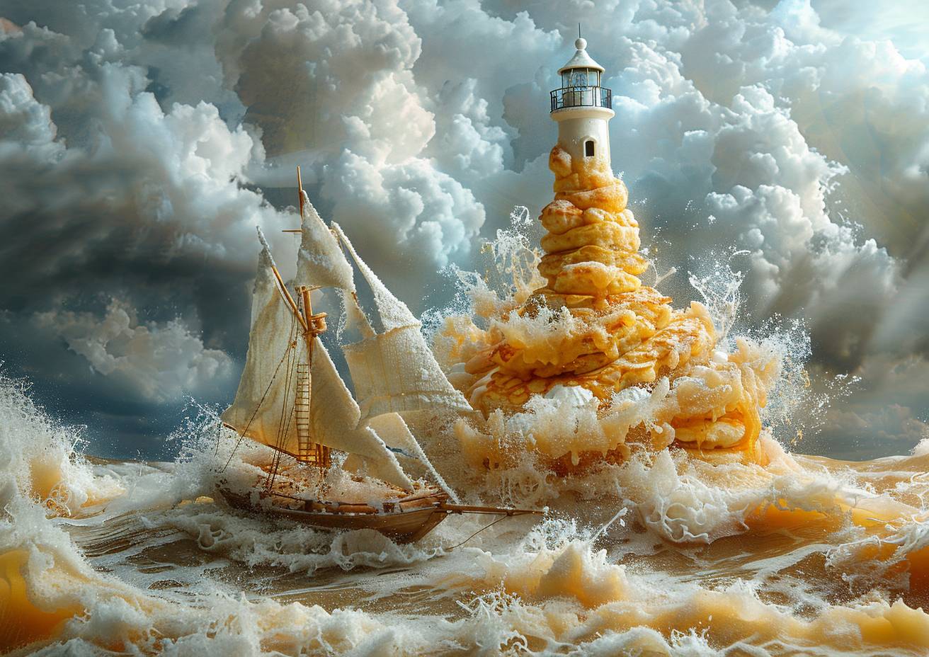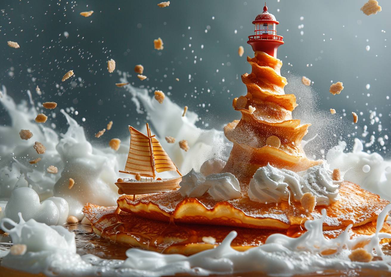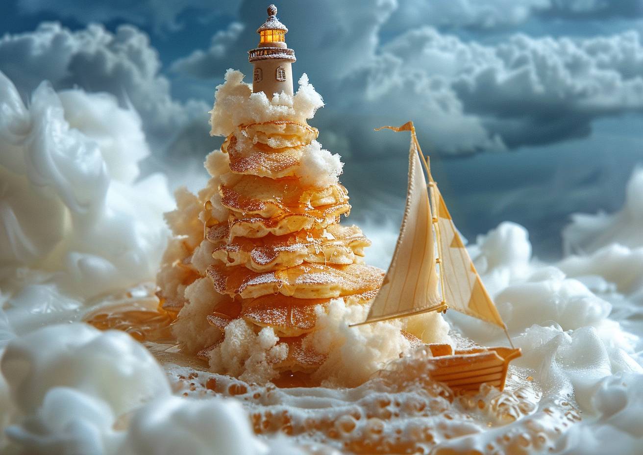 In the style of surreal food photography, a lighthouse made of pancakes, an eponymous sailing boat on an ocean of syrup, dusted with powdered sugar, showcasing a strong visual flow.