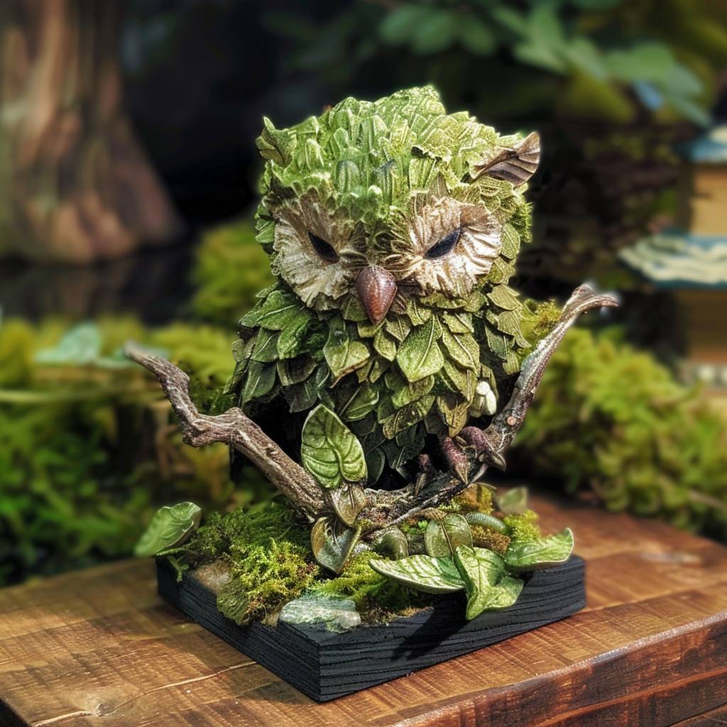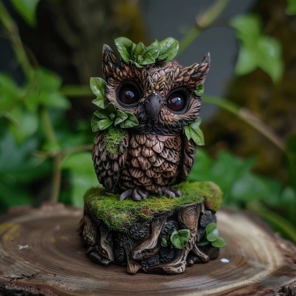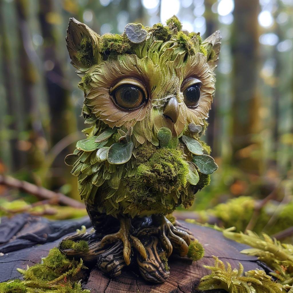 A cute tiny wooden statue of an owlbear, mossy in appearance.