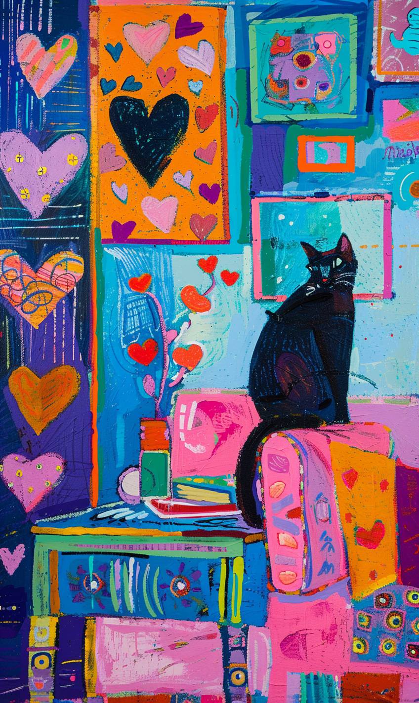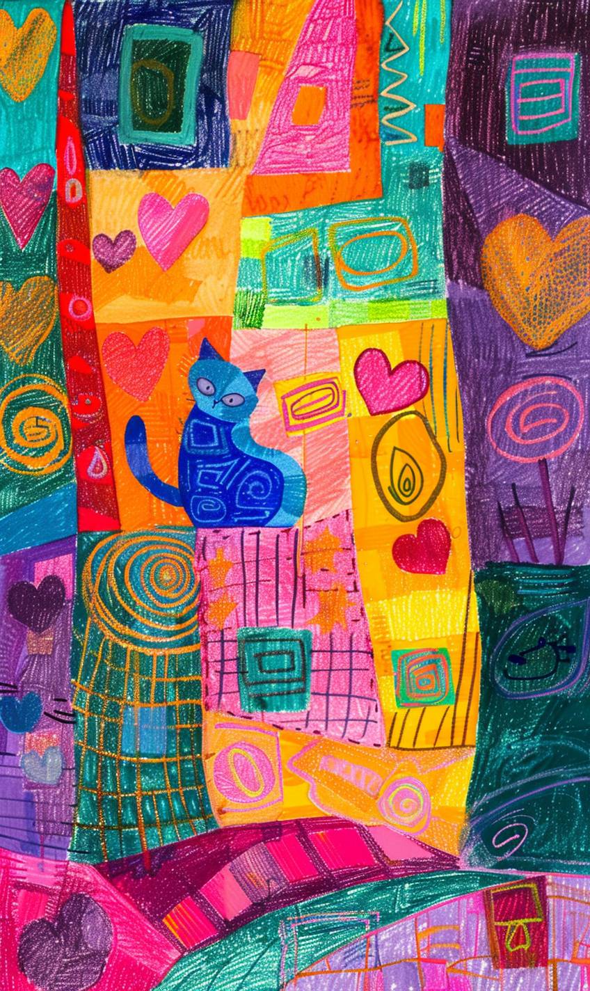 Risograph of a oil pastels Holographic scene with a cat in The Art style of Itzchak Tarkay. Many hearts pattern, Rich front and back views, Color blocks are expressed in a simplistic way, In the style of Surrealism, Colors are mainly bright and colorful, oil painting, sketchy fauvism, in the style of Maira Kalman, Matisse --ar 3:5 --style raw --v 6.0