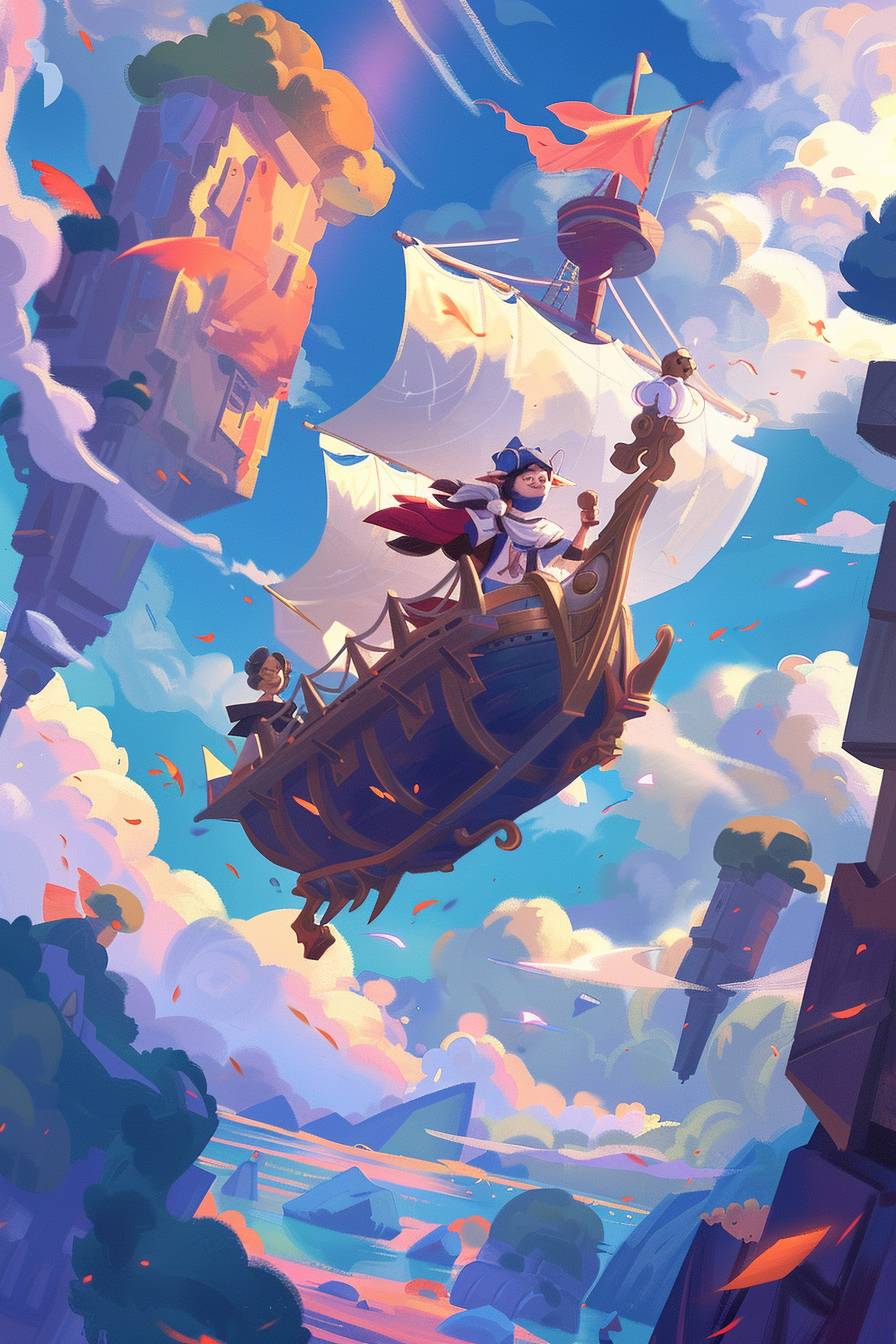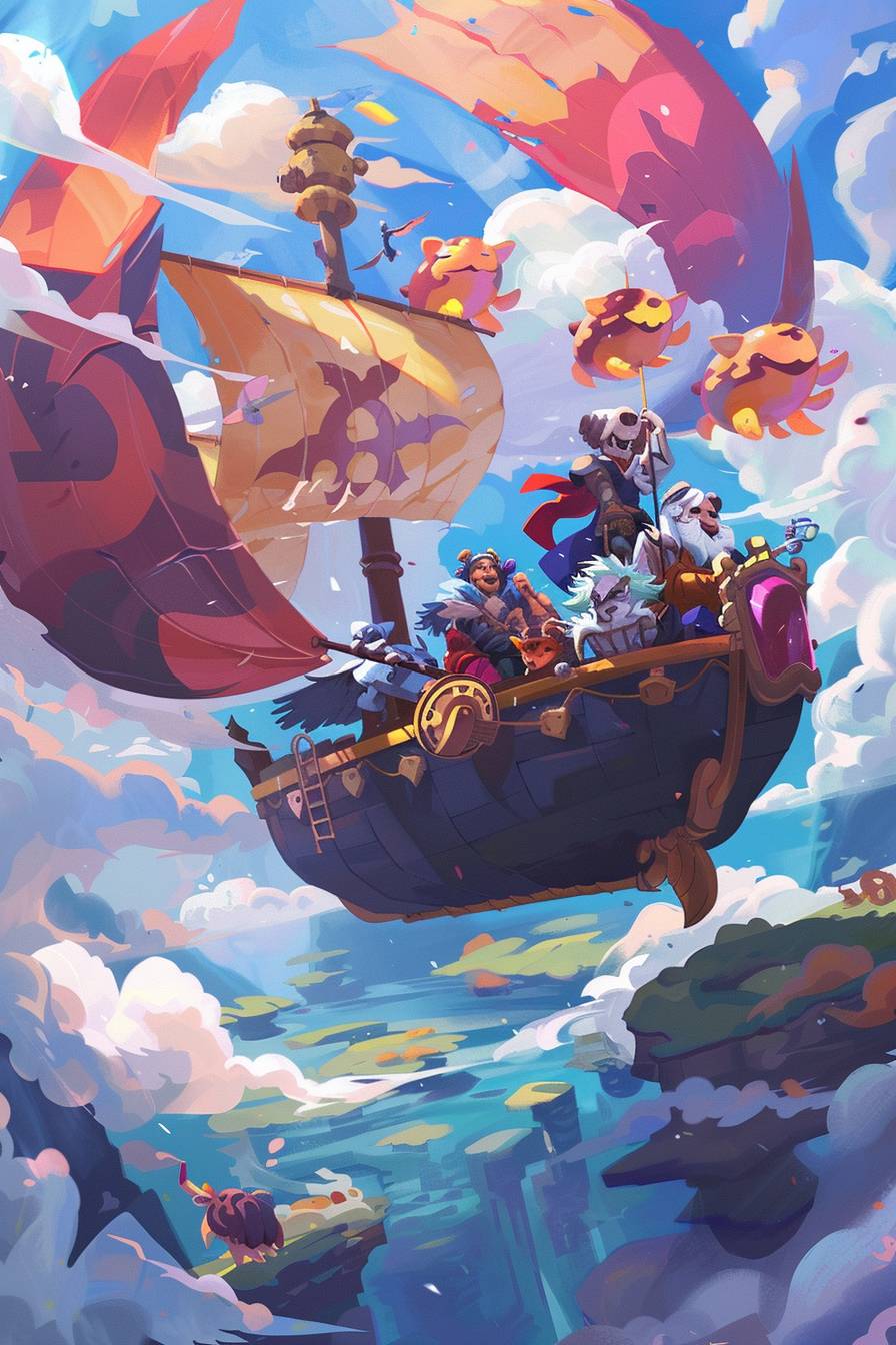 A whimsical steampunk airship sailing through a sky filled with floating islands, surrounded by curious mechanical creatures and vibrant clouds.