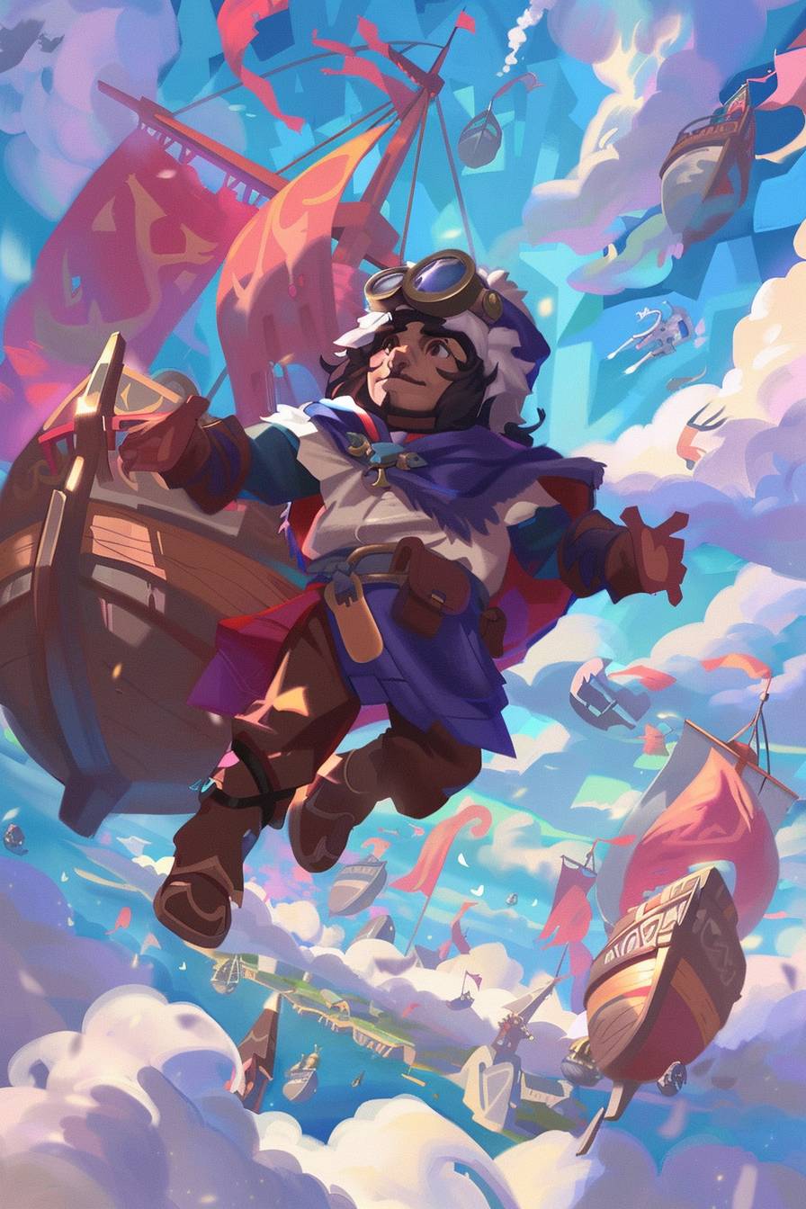 A whimsical steampunk airship sailing through a sky filled with floating islands, surrounded by curious mechanical creatures and vibrant clouds --ar 2:3 --sref 3611874792 --v 6.0
