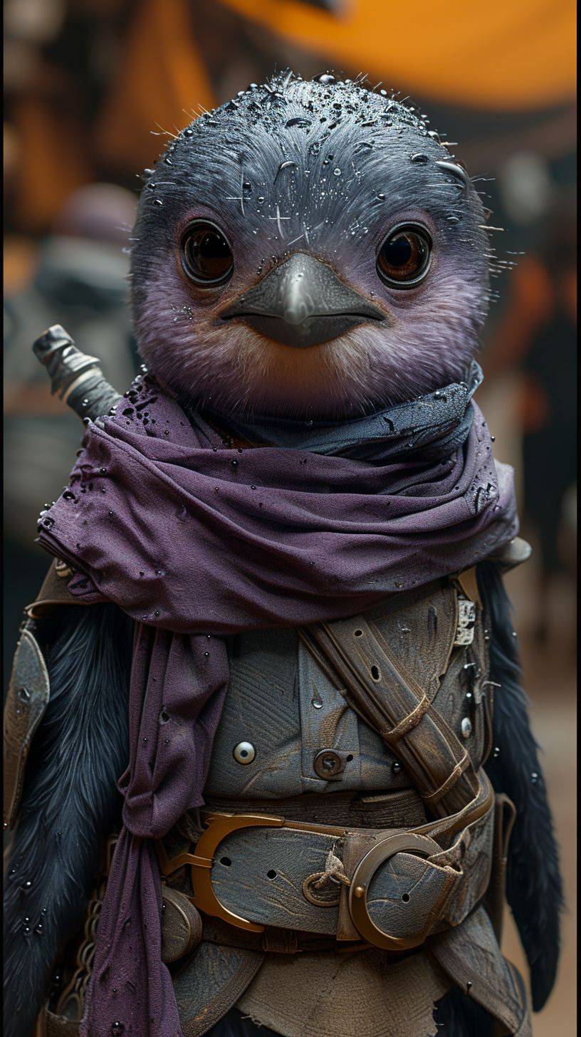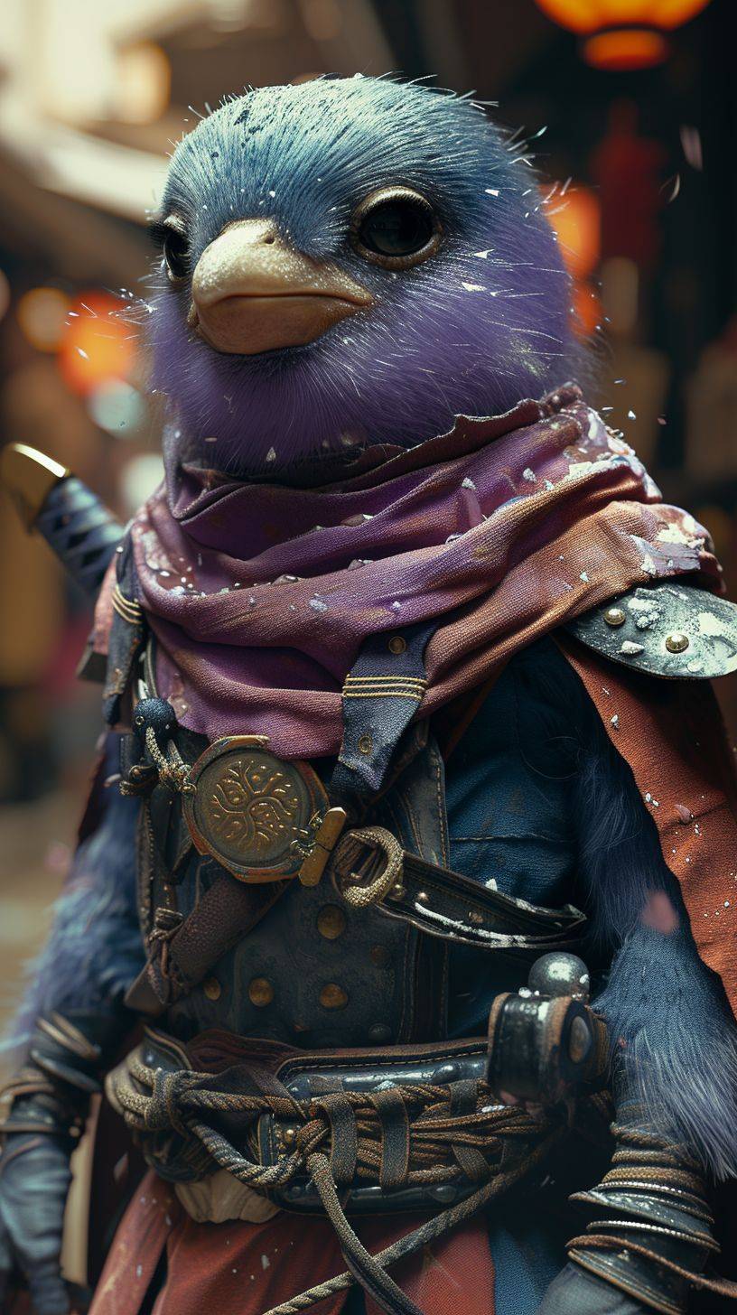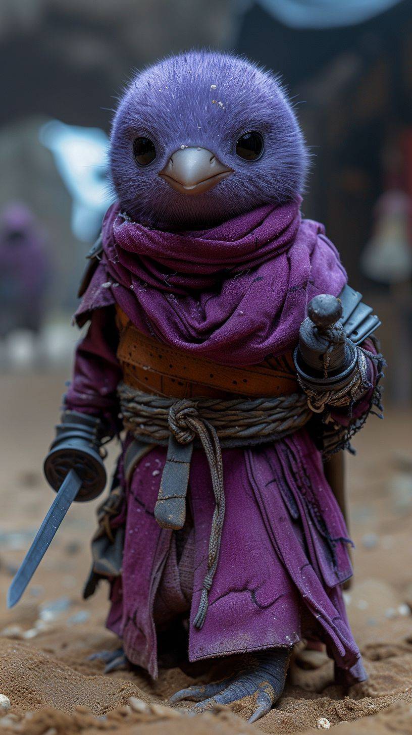 Small purple penguin character, swordsman cosplay, rounded shoulder armor, very short sword, stern expression, peaceful sandy beach afternoon, calm sea, photorealistic --ar 9:16 --v 6 --stylize 1000
